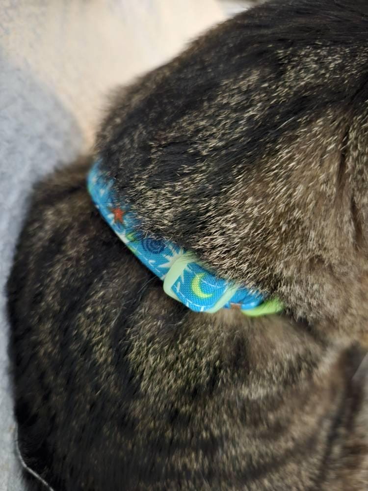 This glow in the dark collar is perfect for all night stalker kitties! The aqua fabric features a star galaxy design that glows in the dark after being exposed to the light. The breakaway buckle also glows in the dark, too. I'm not sure how long the collar will glow for, but it sure is fun!