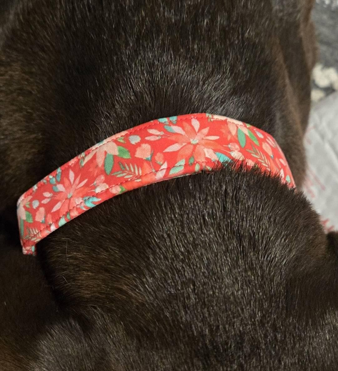 Pretty Red Poinsettias, a classic symbol of the holidays! This Christmas collar is perfect for a girl or boy dog.