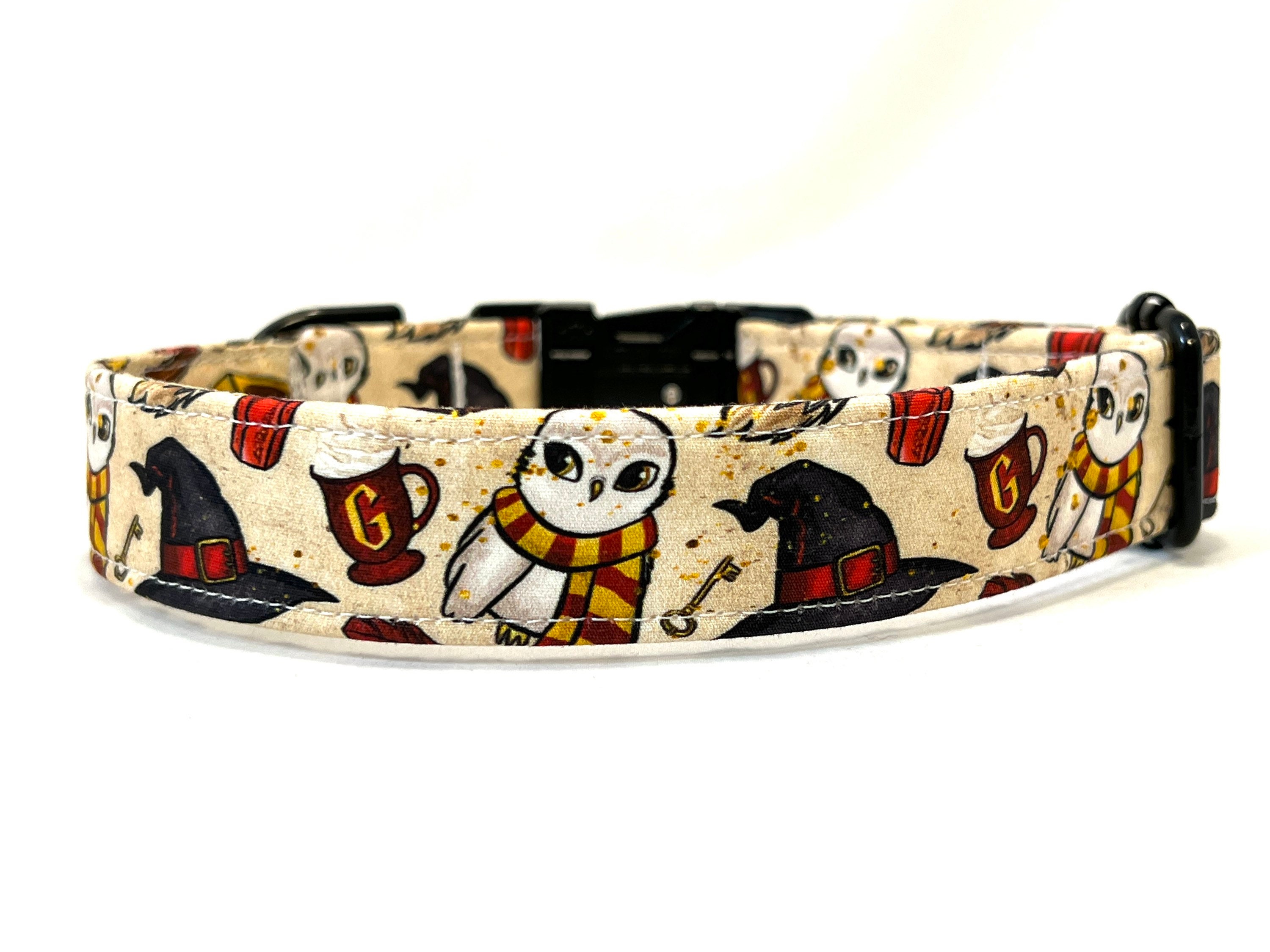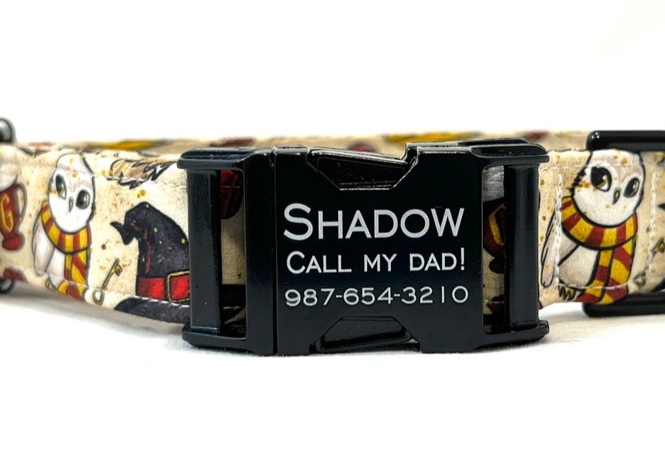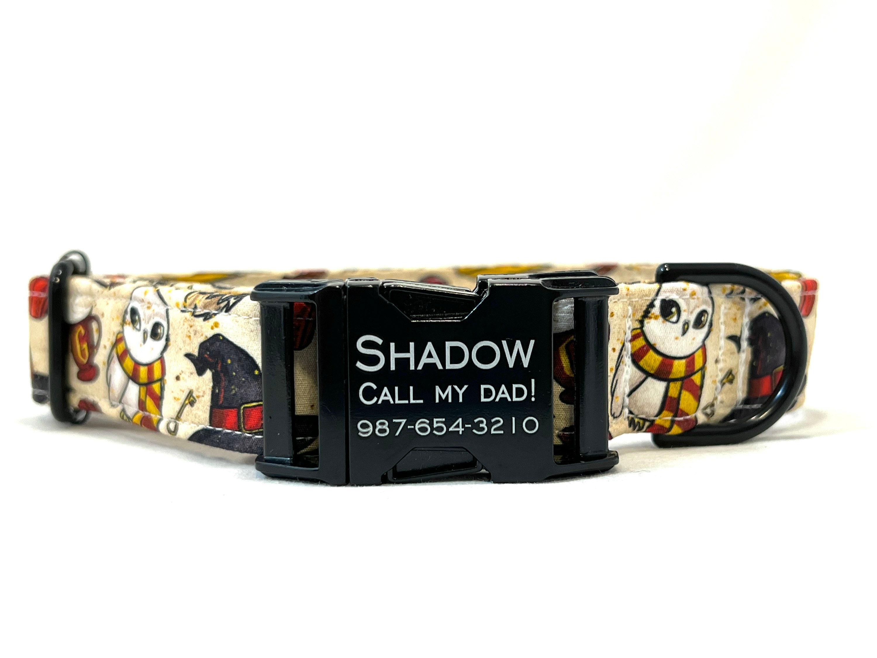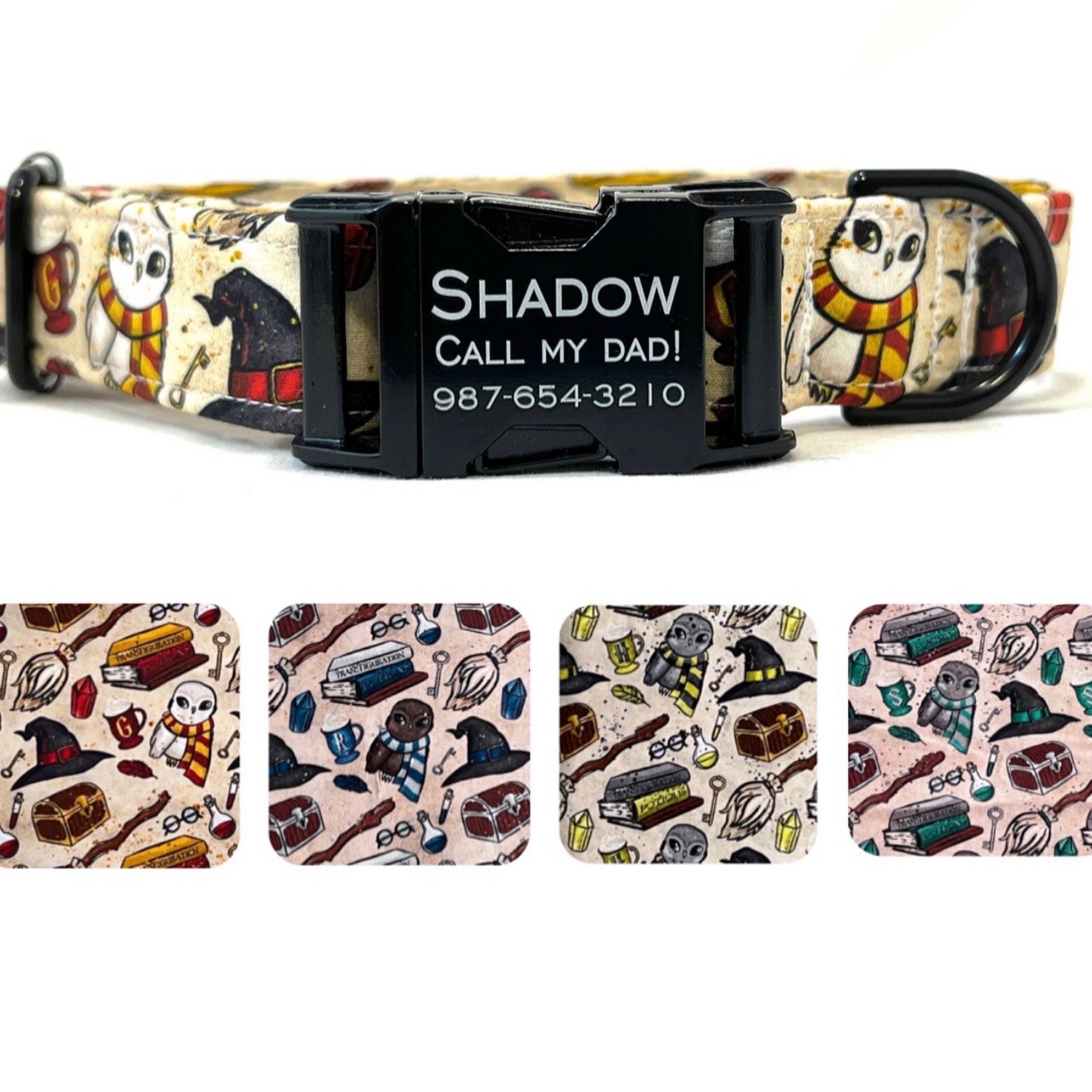 This is the perfect dog collar for those who love wizards and magic! This collar features a personalized laser engraved buckle and would be good for a girl or boy dog.