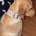 I ordered this watercolor peach collar, with a leash to match for my chocolate lab. Had the olive green buckle put on ( sorry the picture doesn’t show the green very well) and it is a perfect match with the collar. Beautiful online but more beautiful in person. She is going to be the envy at dog camp wearing this. I have ordered multiple collars and leashes through Pinky’s. And each one is perfection and well made. The owner Sunde is the sweetest and always quick to answer if you have any questions.