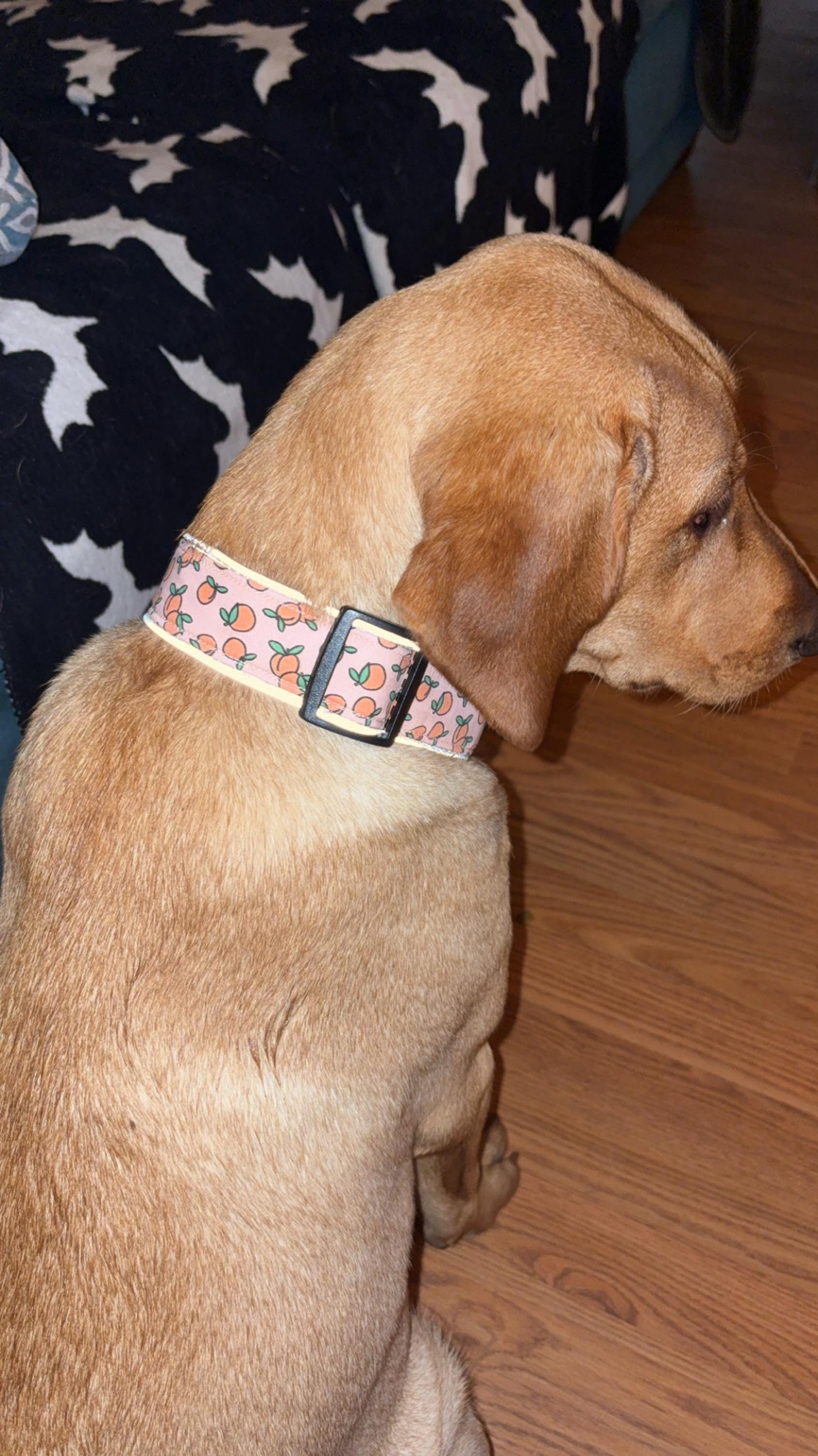 Your pup will look peachy in a pretty dog collar featuring peaches. You get to choose from two different peach patterns, Watercolor Peaches on a white background or Juicy Peaches on a peach background. (Please mention the fabric you want in the personalization section of your order.)