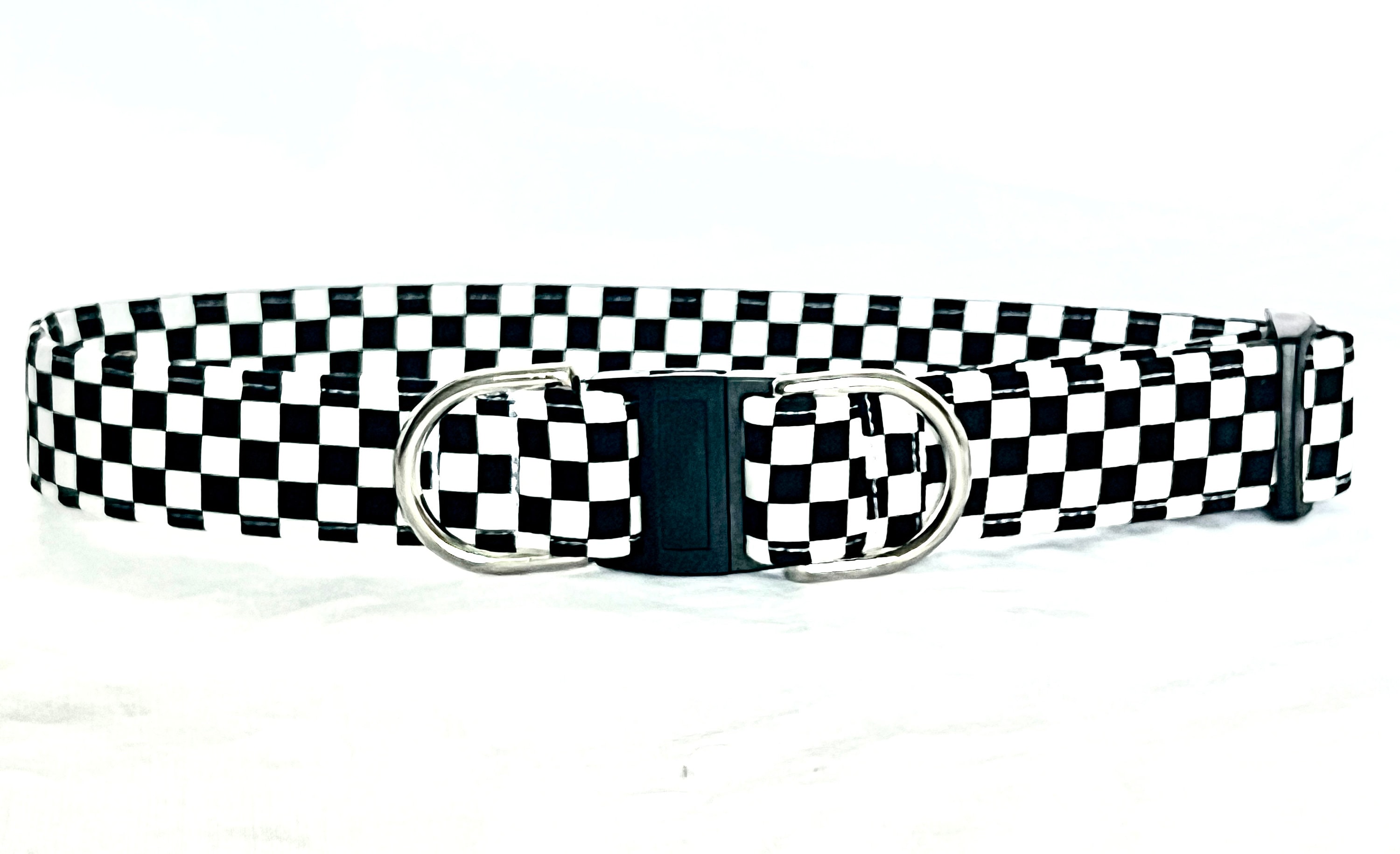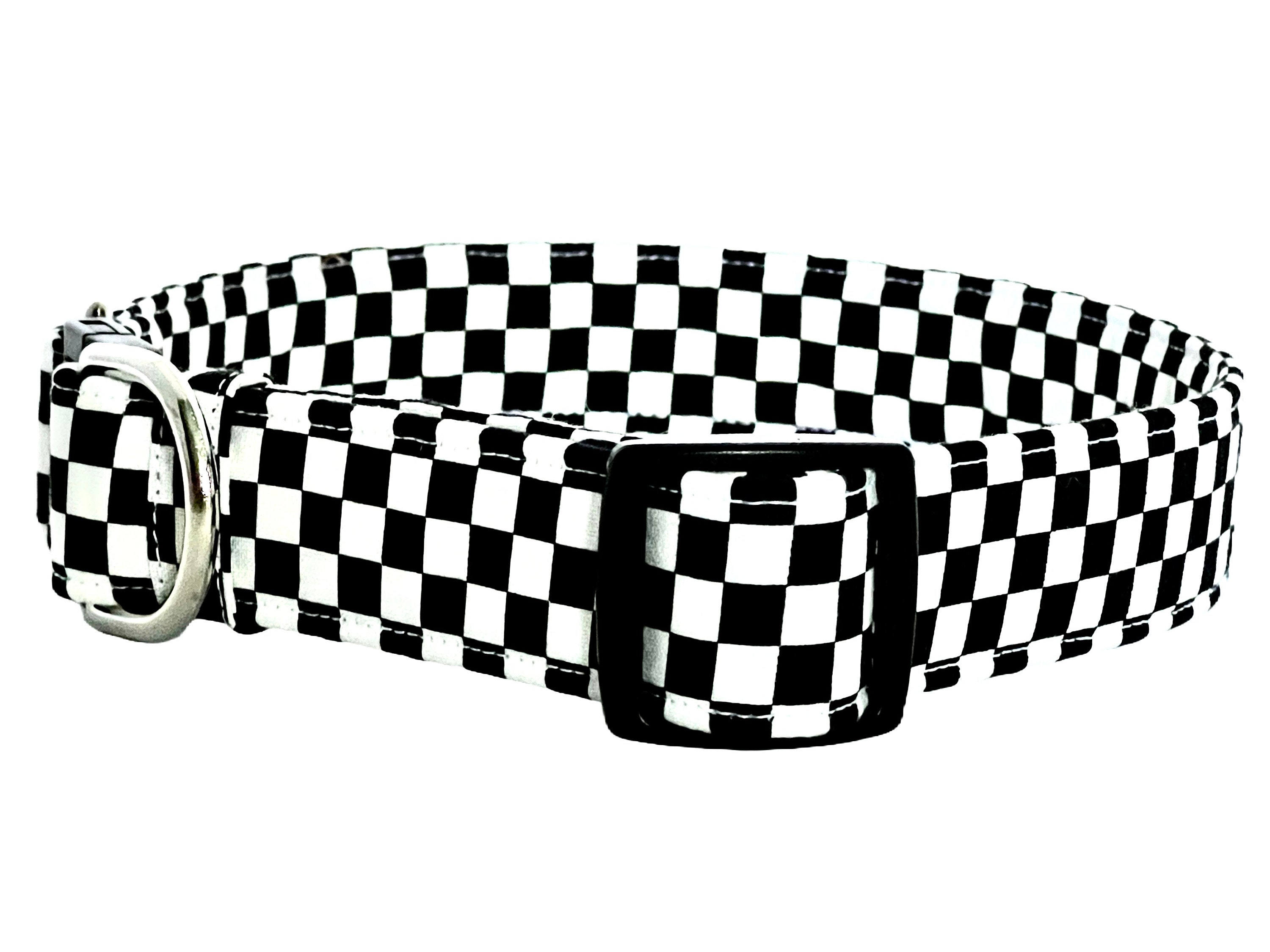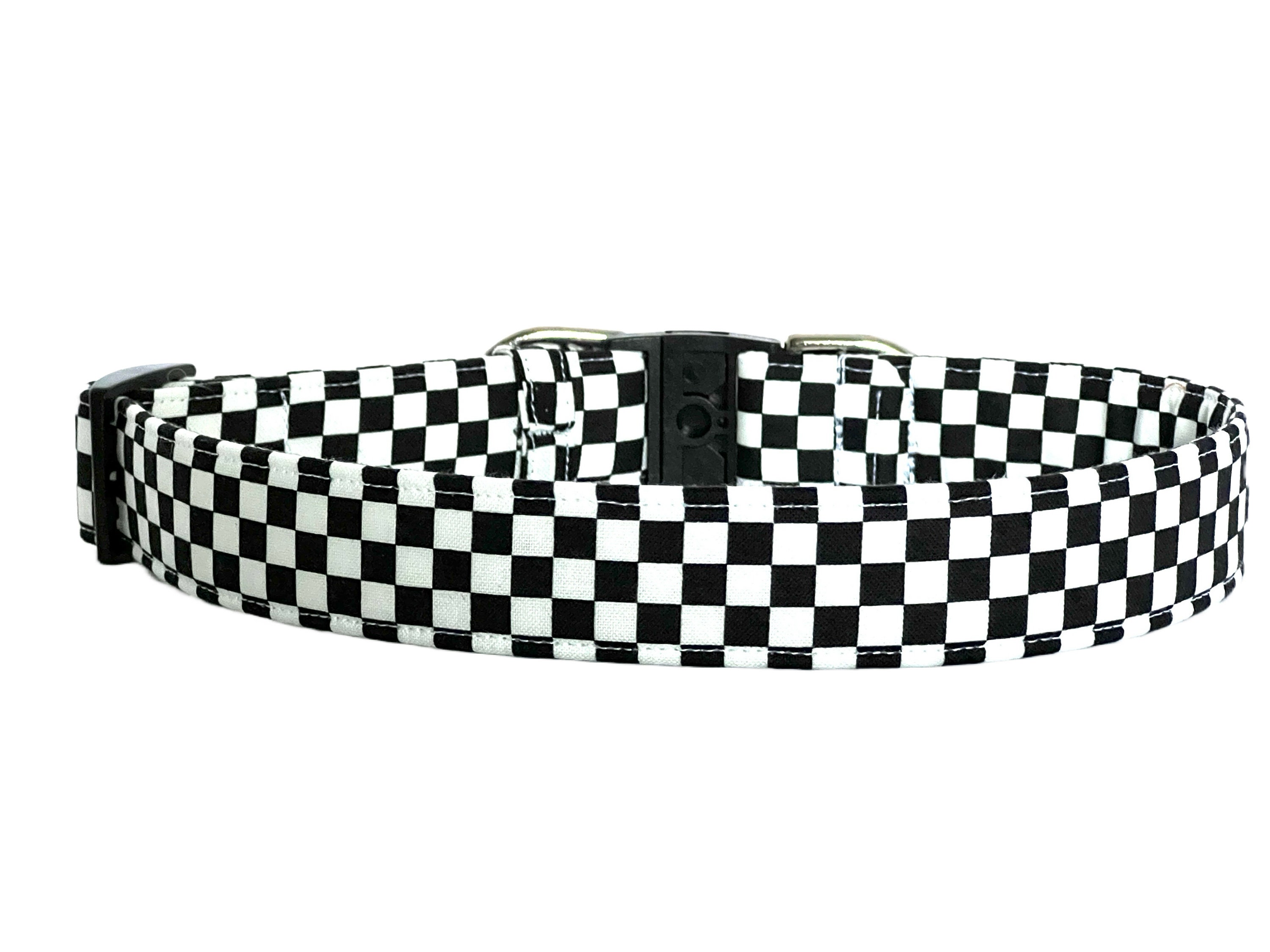 Your pup will be first across the finish line with this charming breakaway dog collar made with black and white checks racing fabric. The design looks just like a checkered flag you see at car races! This is the perfect collar for car racing fans!
