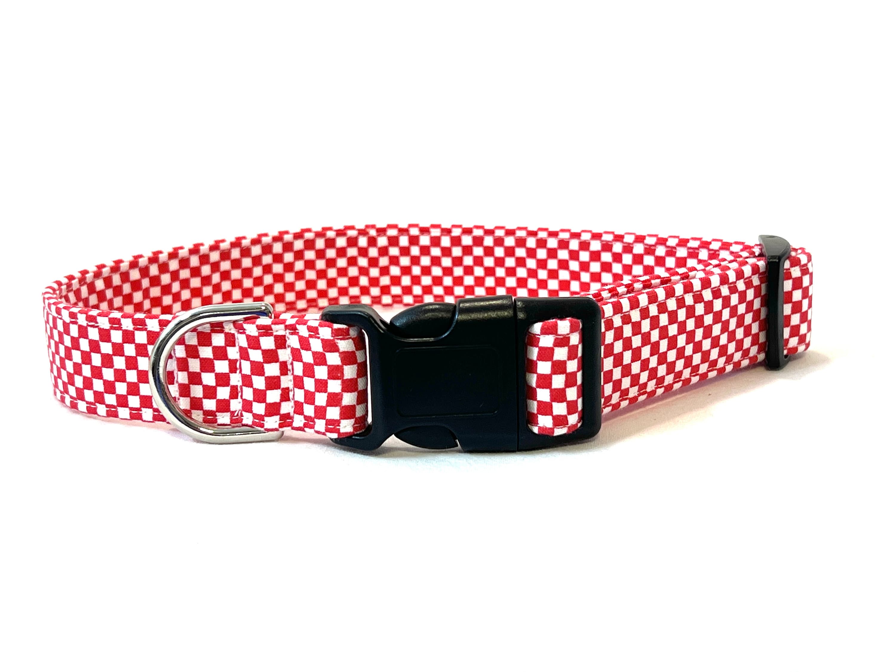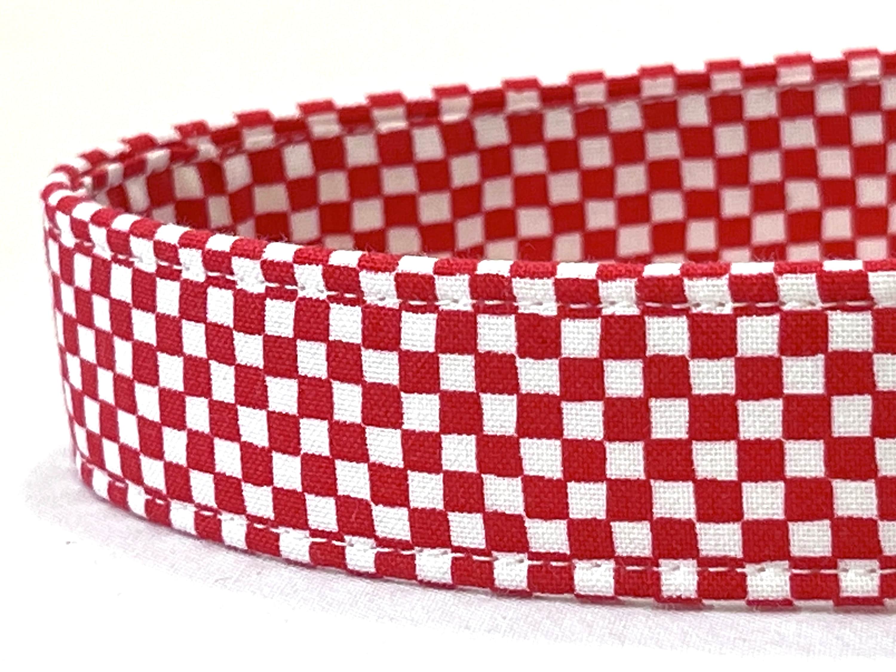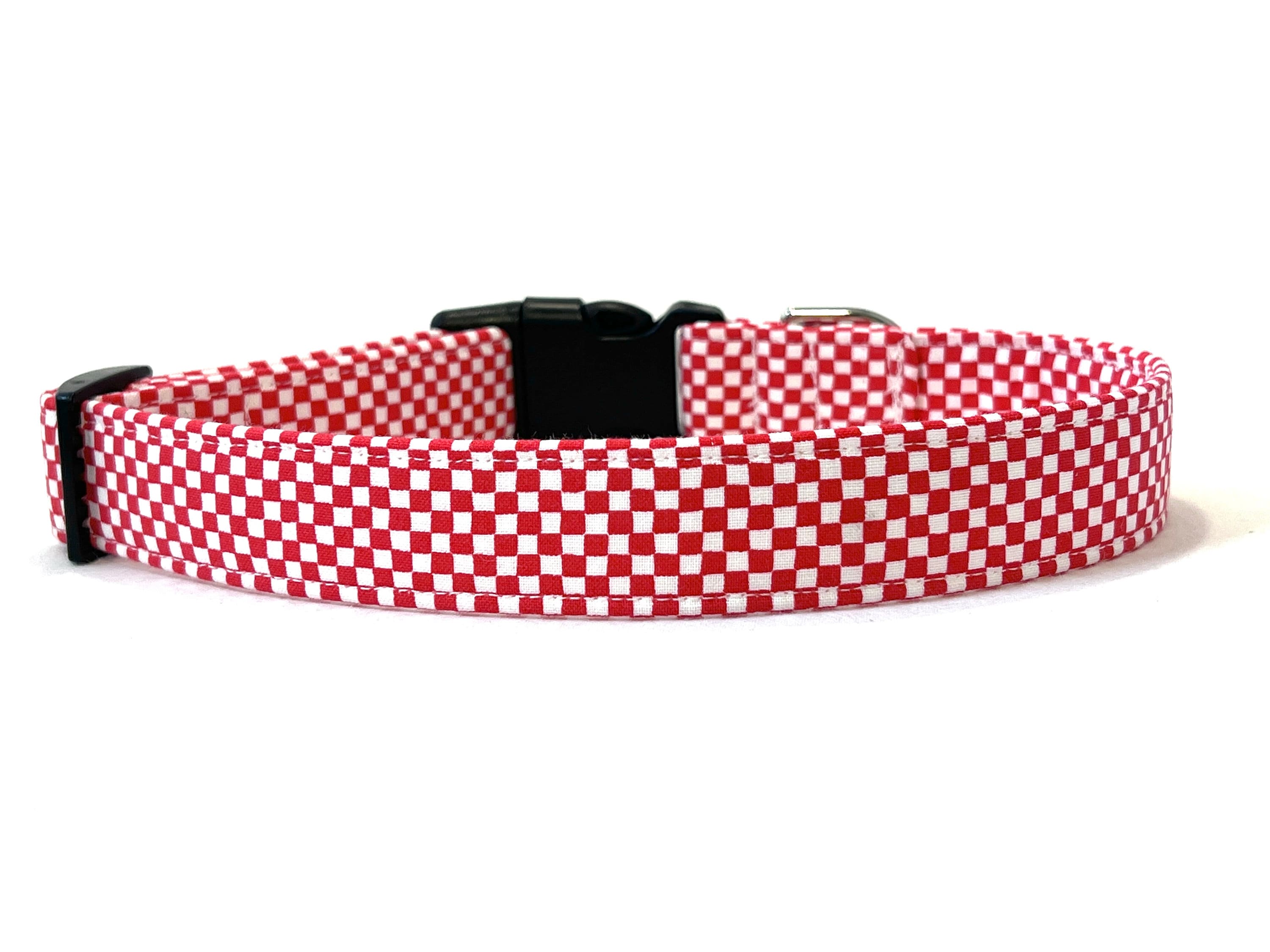 This tiny checks fabric dog collar is available in five color choices: Red/White, Dark Navy/Blue, Orange/Pink, Blue/Light Blue, and Green/White.