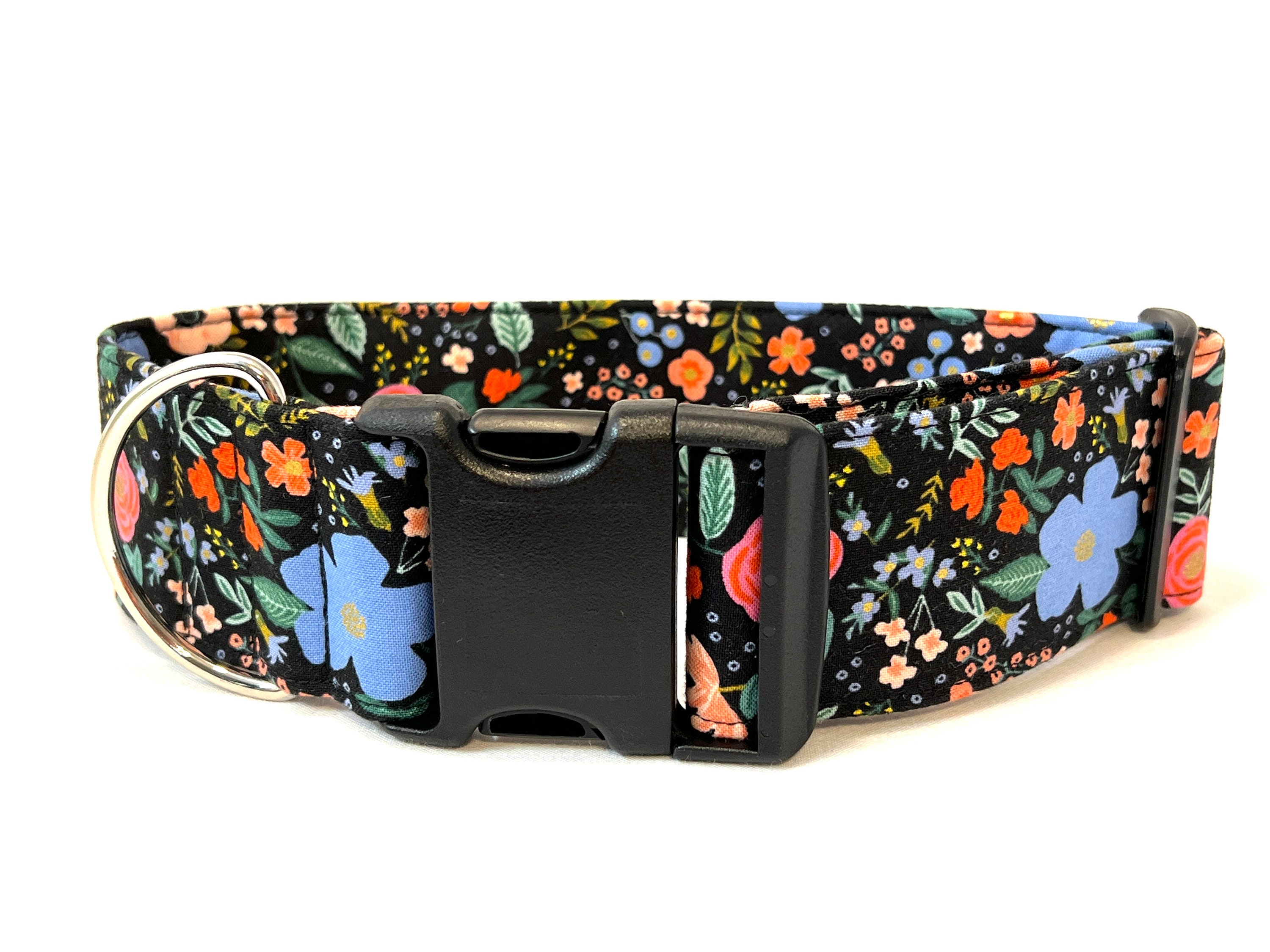 This print is from the Primavera collection and features a black background with pretty blue, pink and red flowers and gold metallic accents. Because the fabric's pattern varies, the pattern on your collar may be a bit different than what is shown.