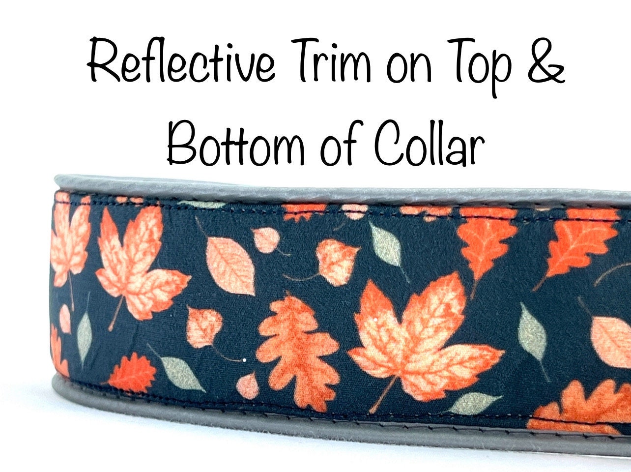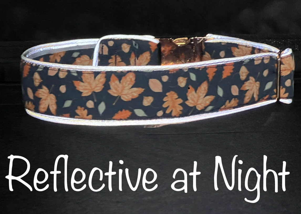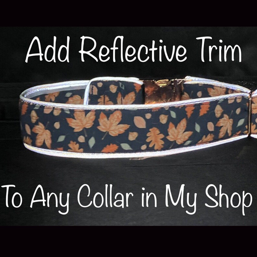 Pick any 5/8, 3/4", 1" or 1.5" wide dog collar in my shop and I will add reflective trim to the top and bottom of the collar, so the collar will reflect light that shines on it at night. This will increase safety by making your dog more visible at night.