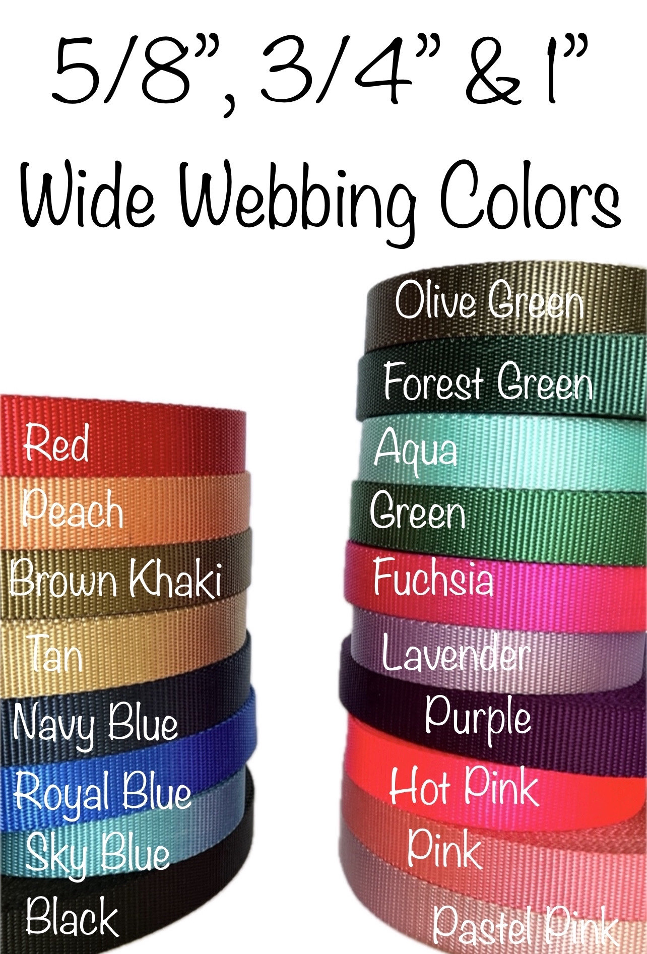 I offer 6 engraved buckle color choices in 5/8" 3/4" and 1" widths: