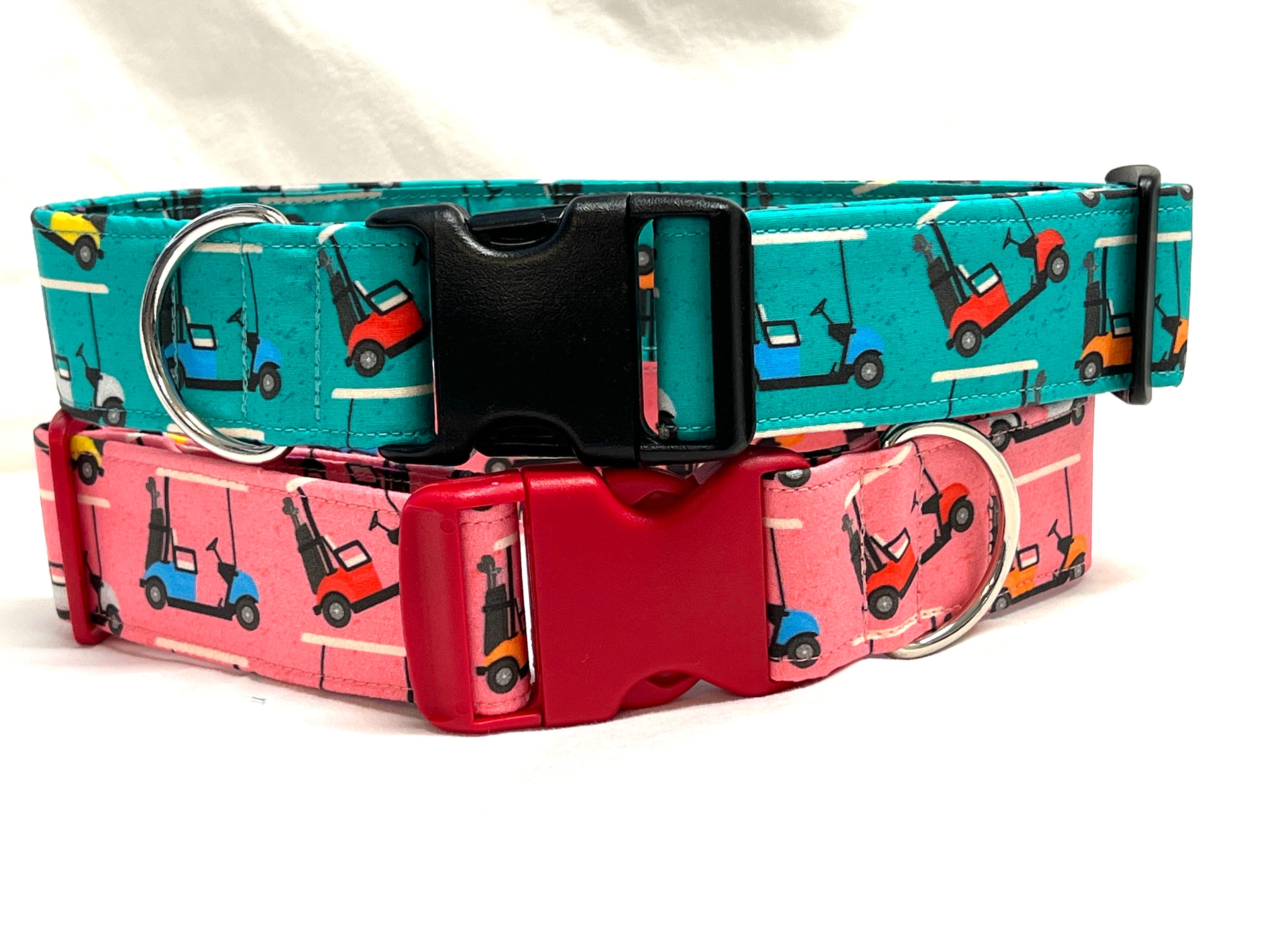 Your pooch will look so cute in this adorable golf cart 1.5” wide collar available in pink or turquoise.