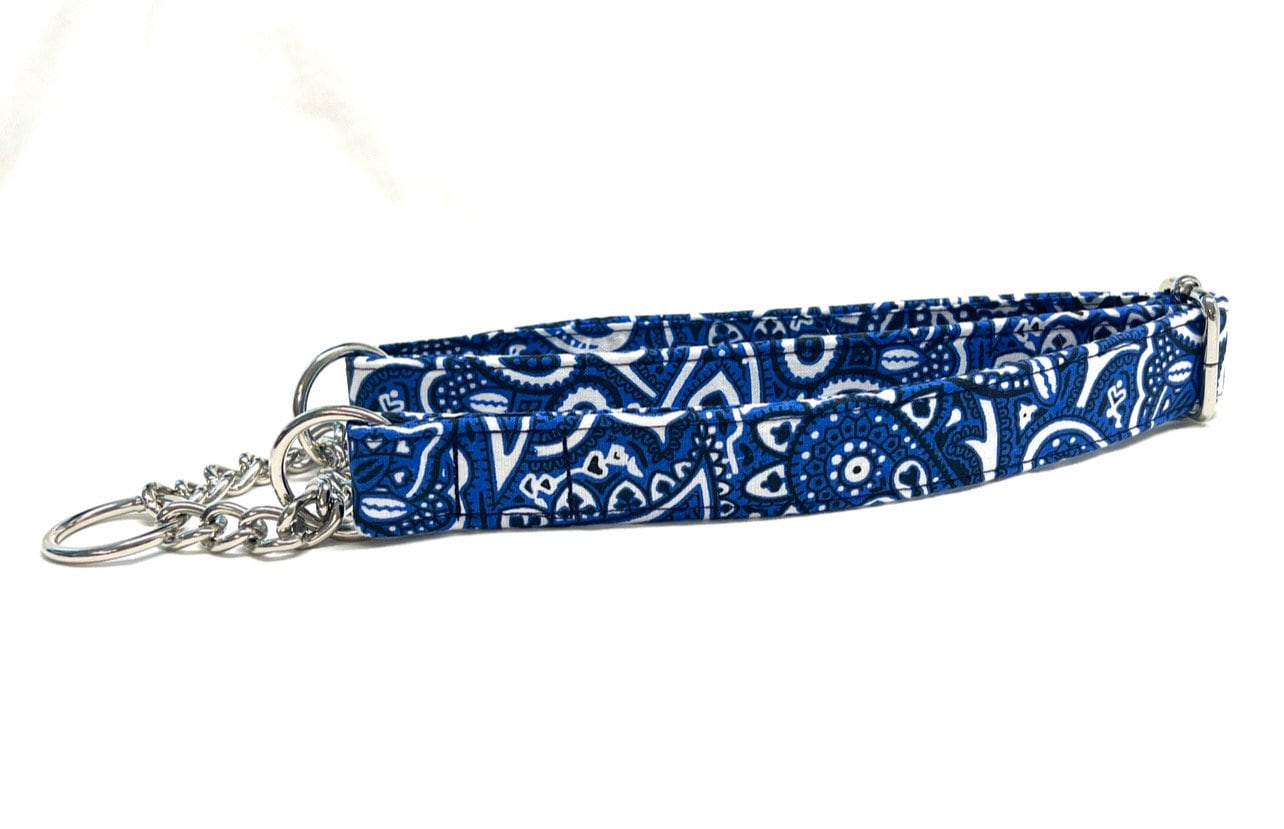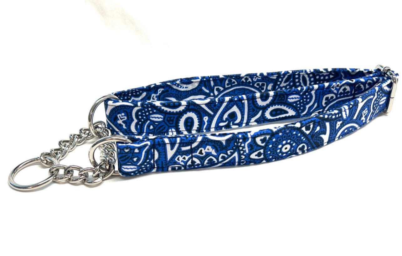 Now you can get paisley bandana or classic blue jean denim chain martingale dog collars for your pup! Choose between red or blue paisley, paisley denim, or solid light blue or dark blue denim.