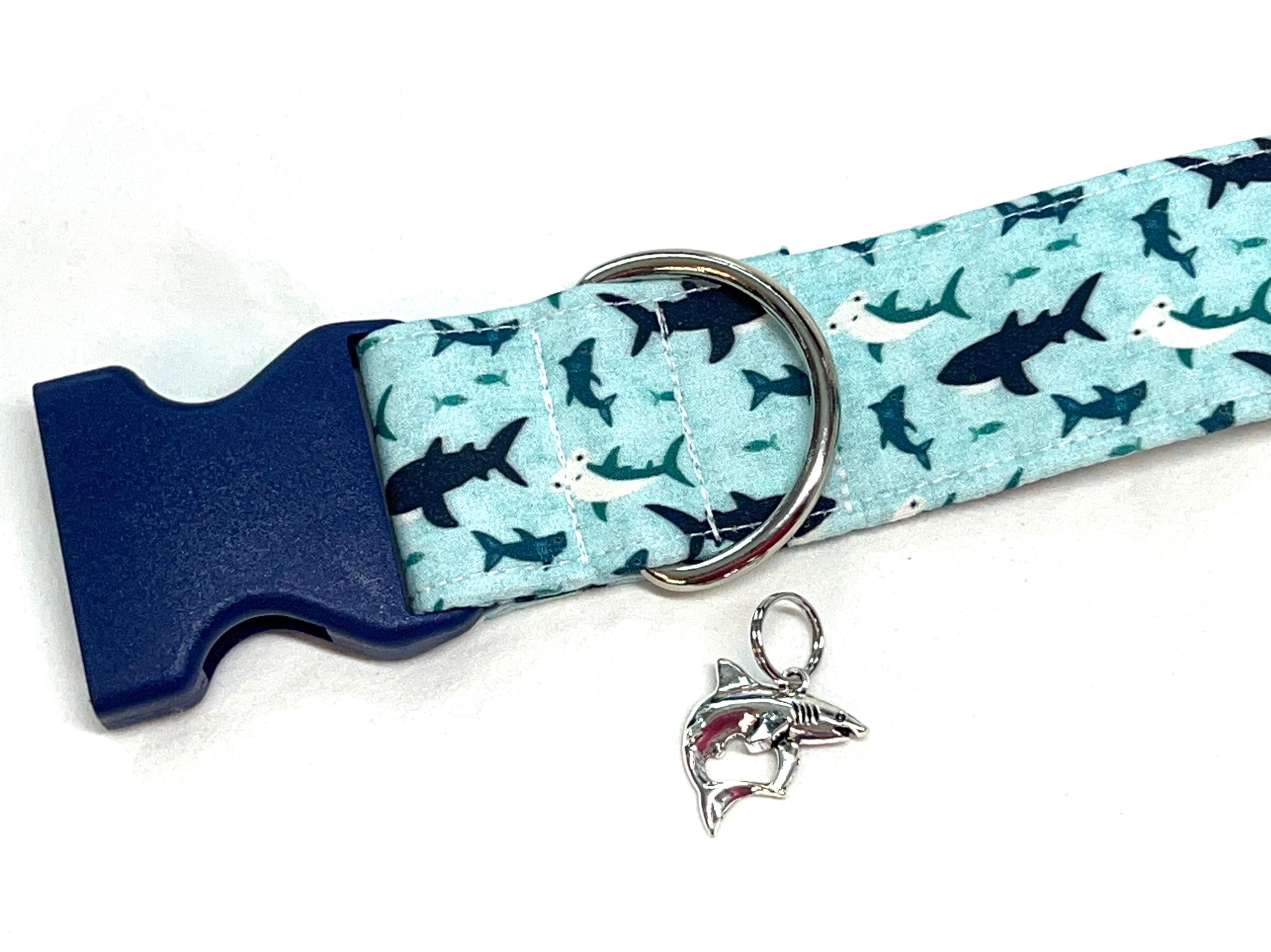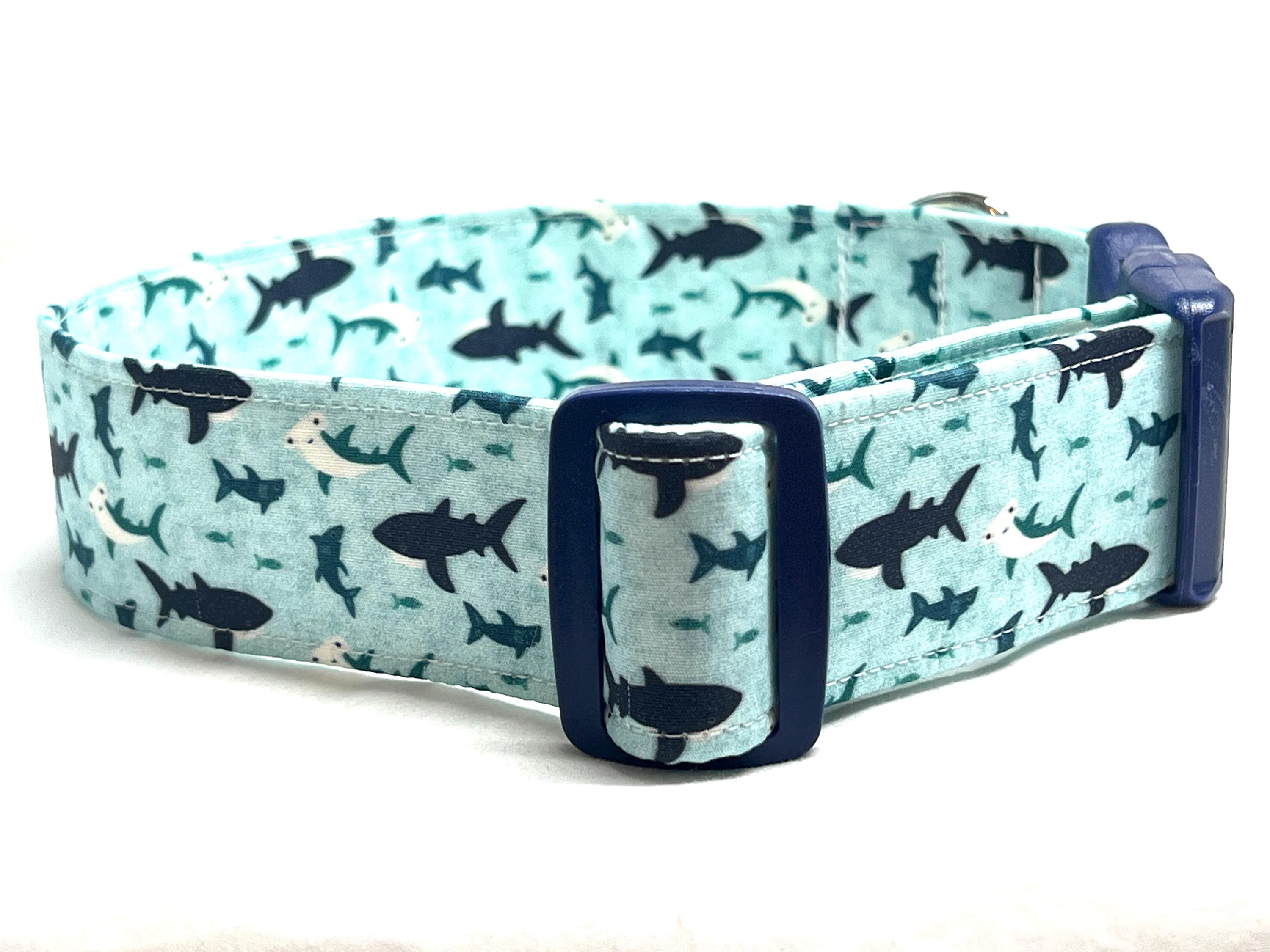 The summer will be "Paw-fect" for your dog with this fun swimming sharks fabric collar featuring great white sharks and hammerhead sharks. this collar is perfect for a boy or girl dog!