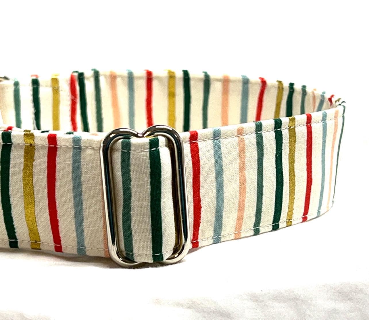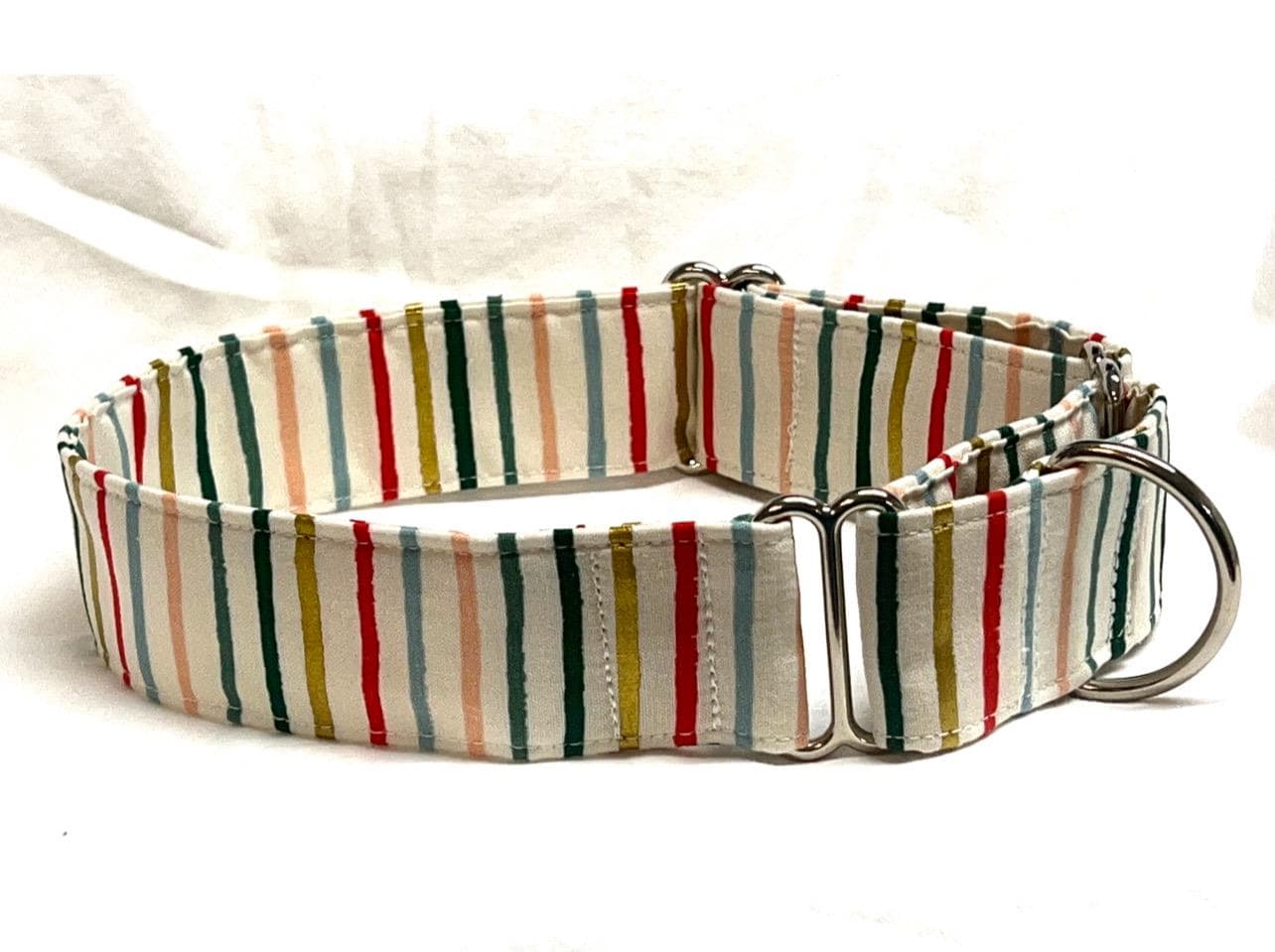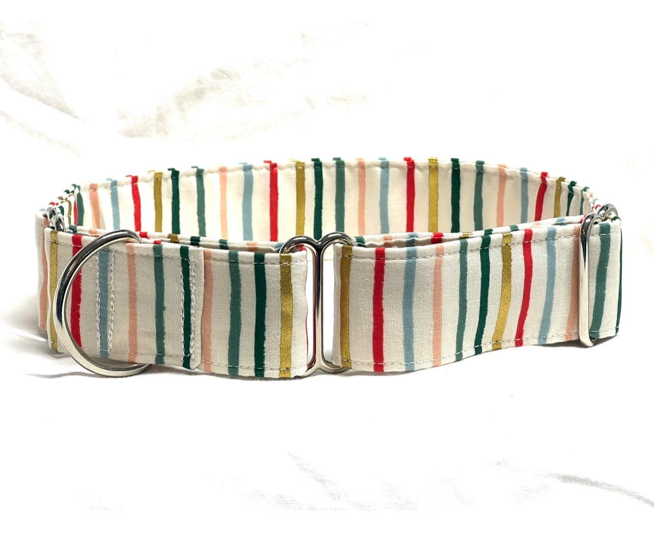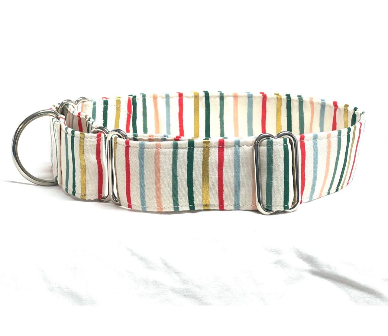 Your dog will look great for the holidays with a beautiful martingale collar custom-made with Rifle Paper Co Multicolor and Metallic Gold Stripes fabric. This Christmas martingale collar is perfect for a girl or boy dog. This multicolor stripes print can actually be worn year round! It has metallic gold stripes that look great with silver or gold hardware.