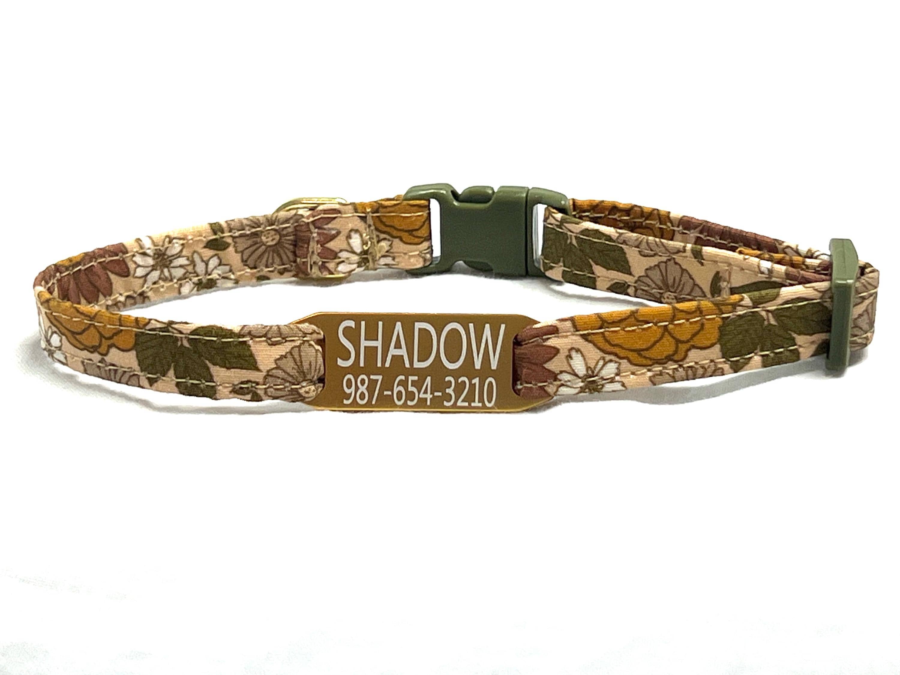 All Pinky's Pet Gear cat collars are 3/8" wide and are made with a breakaway buckle. They also come with a free bell! These pretty Rifle Paper Co fabrics make beautiful collars for your cat and now you can get them with an ID tag! There are three prints available; pink wildflowers, blue wildflowers and black wildflowers.