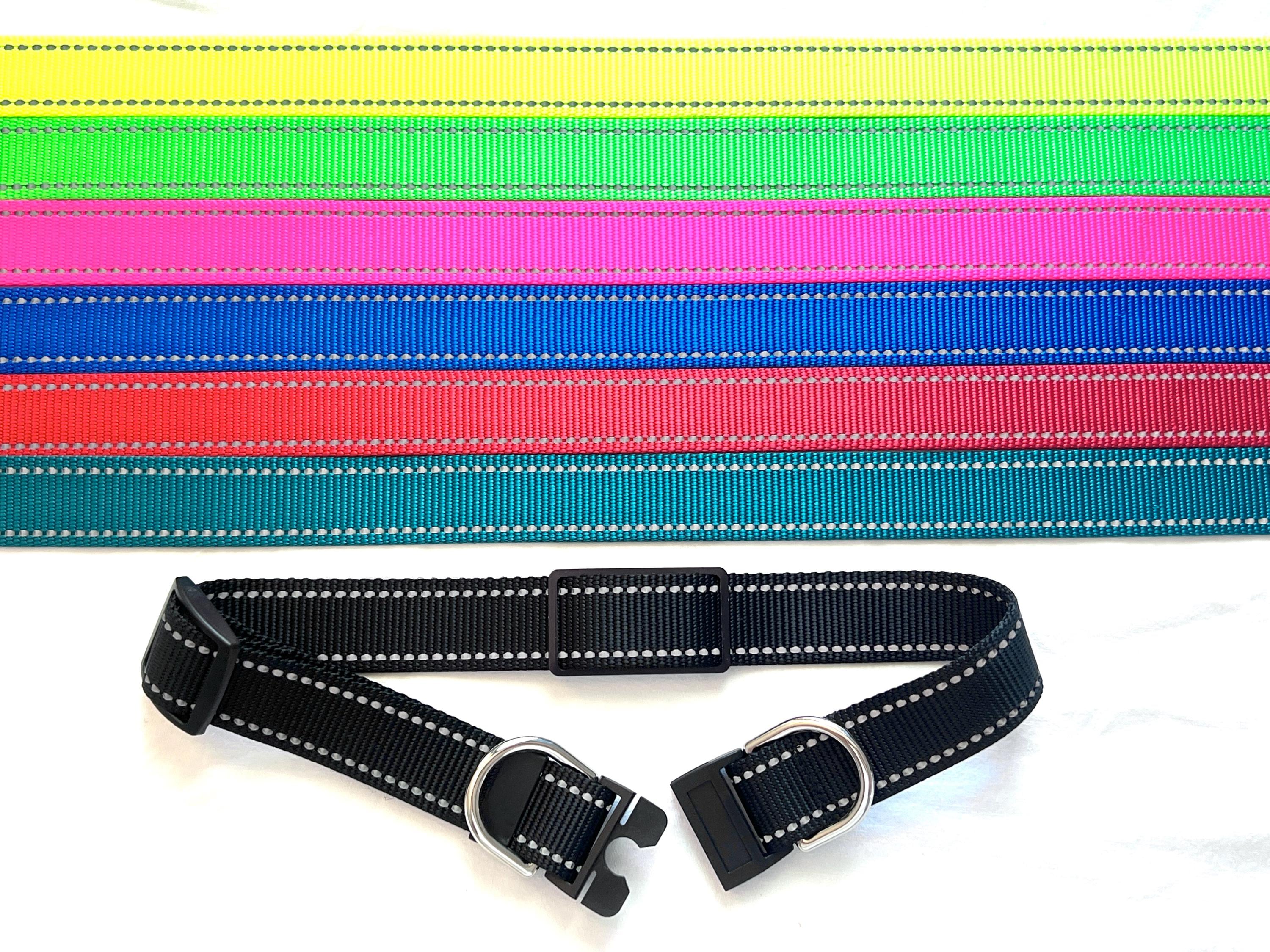 Pinkys' Pet Gear dog collars with a breakaway buckles are now available in durable reflective nylon webbing! The webbing has stitching that is reflective when light shines on it at night, making it easier to see your dog in the dark.