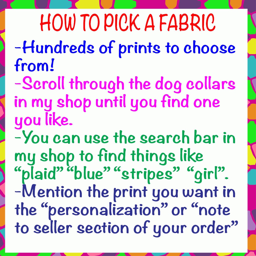 -My items are custom made-to-order. which means I do not have a premade supply of items. I handmake each order myself after receiving the order and include your choice of fabric, collar size and buckle type (plastic, metal or engraved) and buckle color (for plastic buckles).