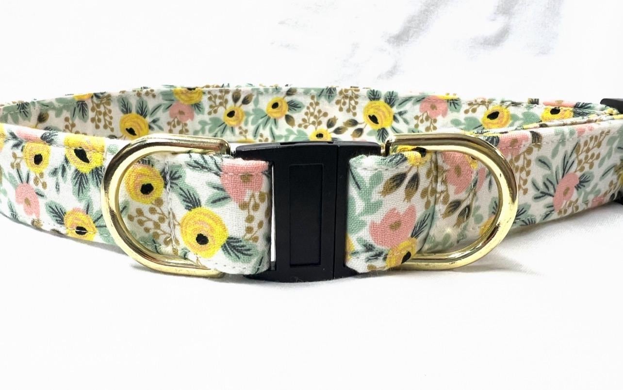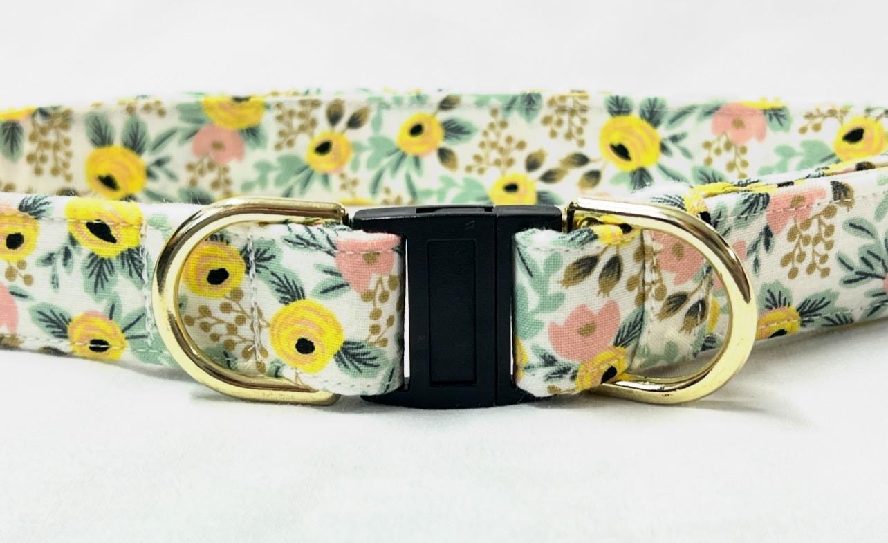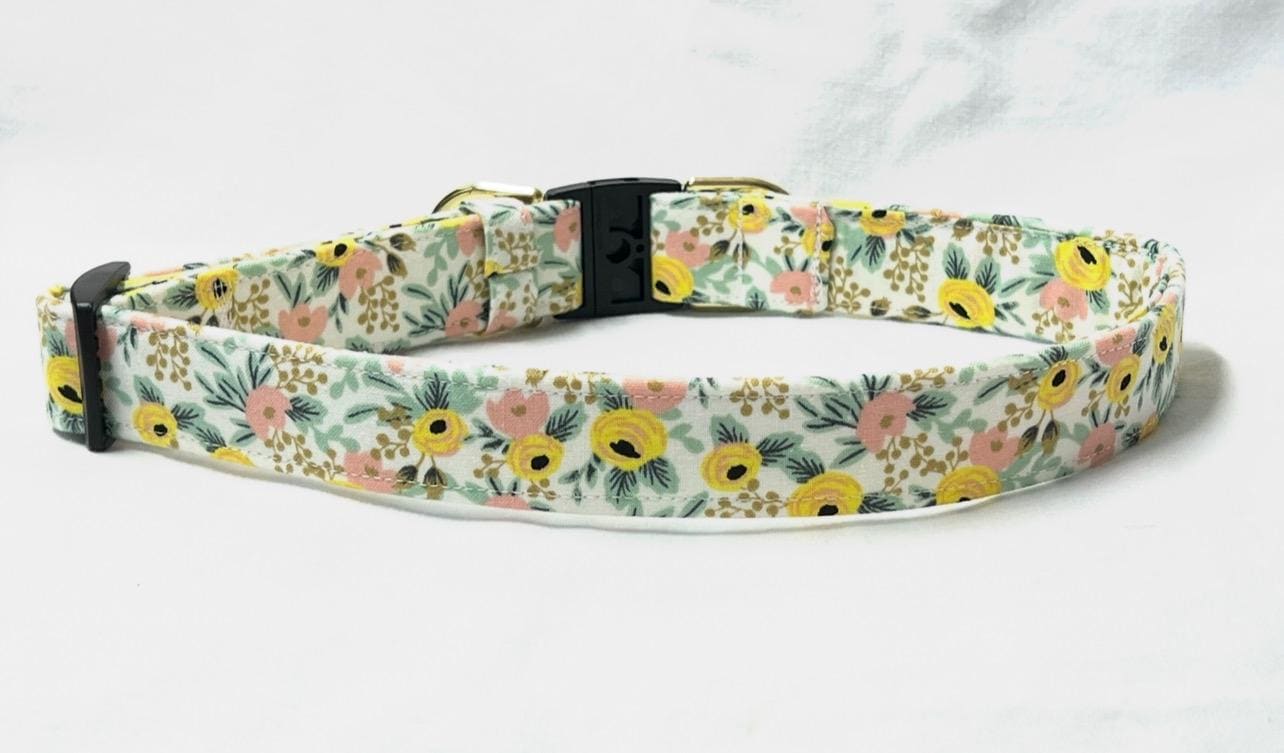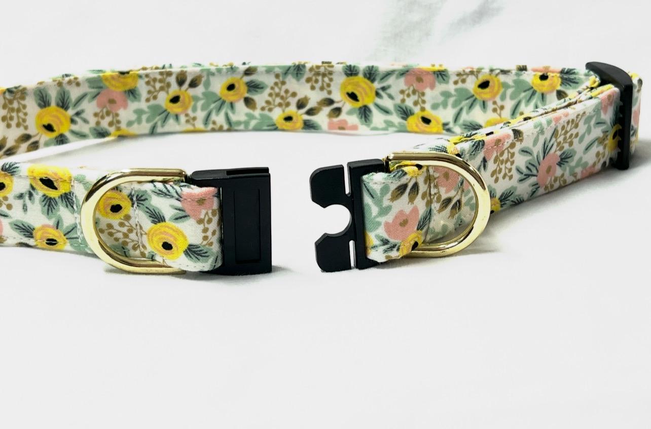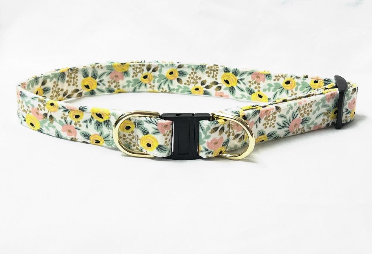Your dog can stay safe with a BREAKAWAY dog collar made in the beautiful Rifle Paper Co “Le Fleurs” print, which is available in 11 colors.