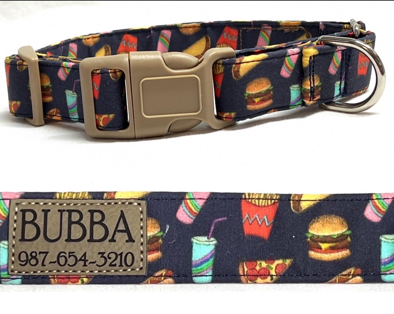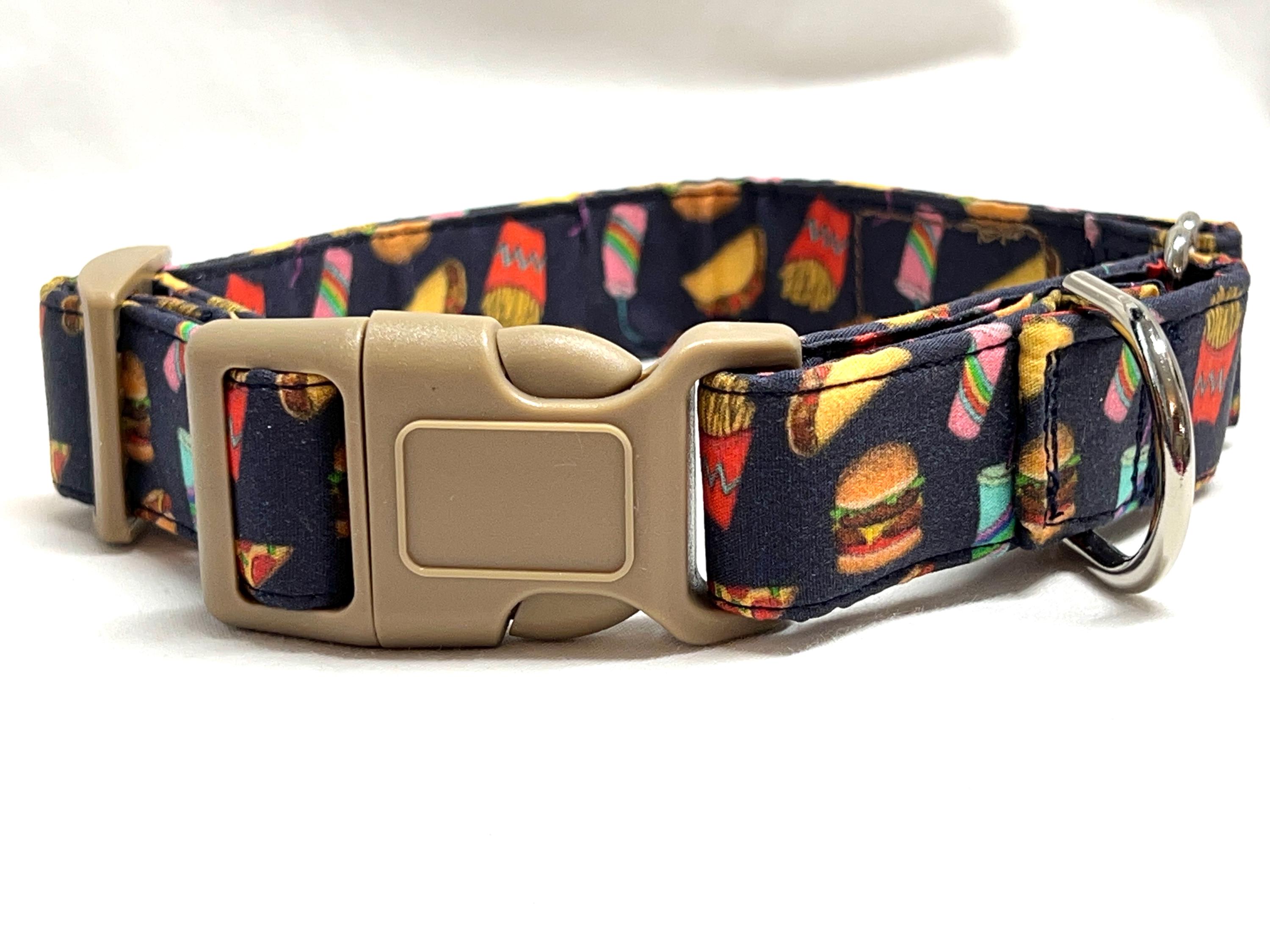 (If you like the collar shown in the example photos, the fabric is called: "Junk Food - Hamburgers - Fries - Tacos")