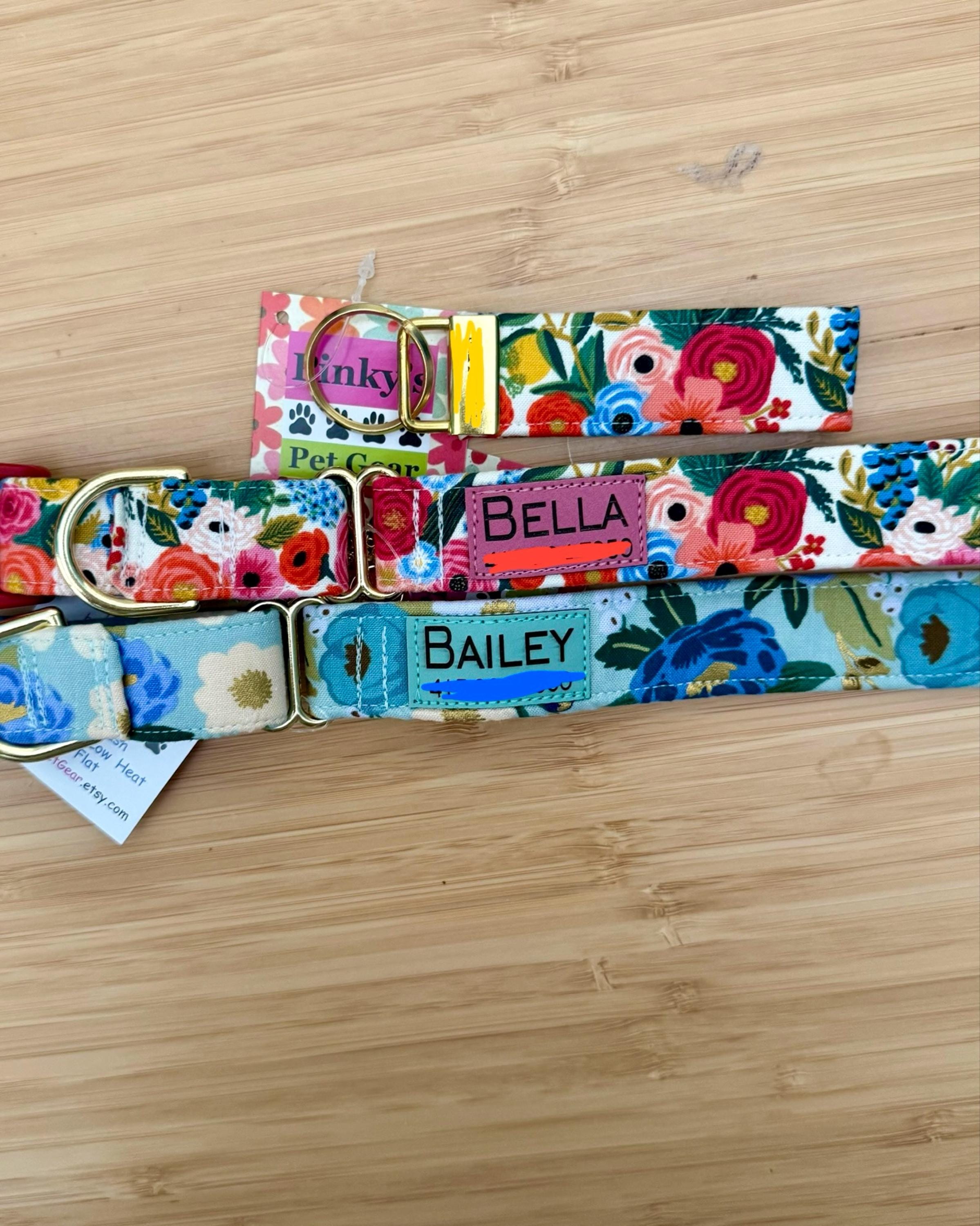 How cool is this?! Create your own custom martingale dog collar! Pick any fabric that I make dog collars with in my shop and I will make you a buckle martingale dog collar with an engraved pleather name patch.