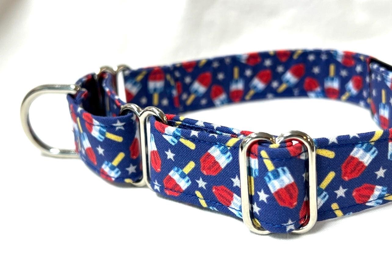 So fun and patriotic! Your pup will be so stylish wearing this charming martingale dog collar featuring red white and blue rocket pop frozen treats!