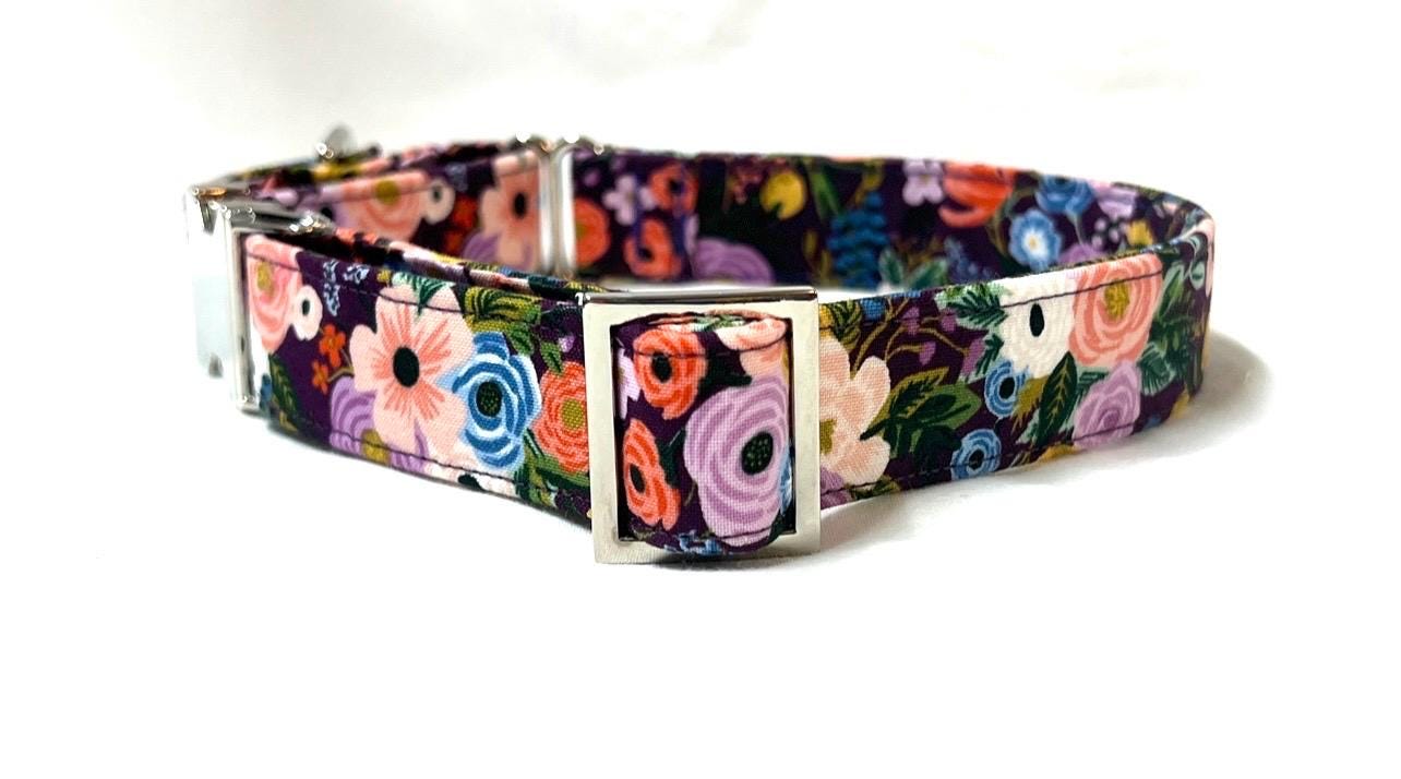 This martingale collar is made with Rifle Paper Co Garden Party design in the lilac on plum colorway.