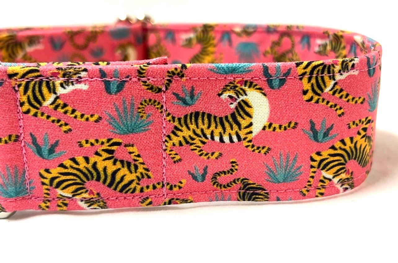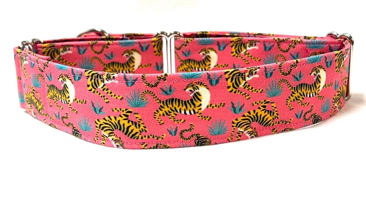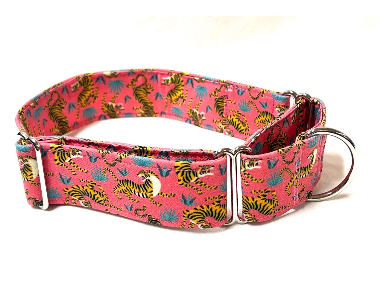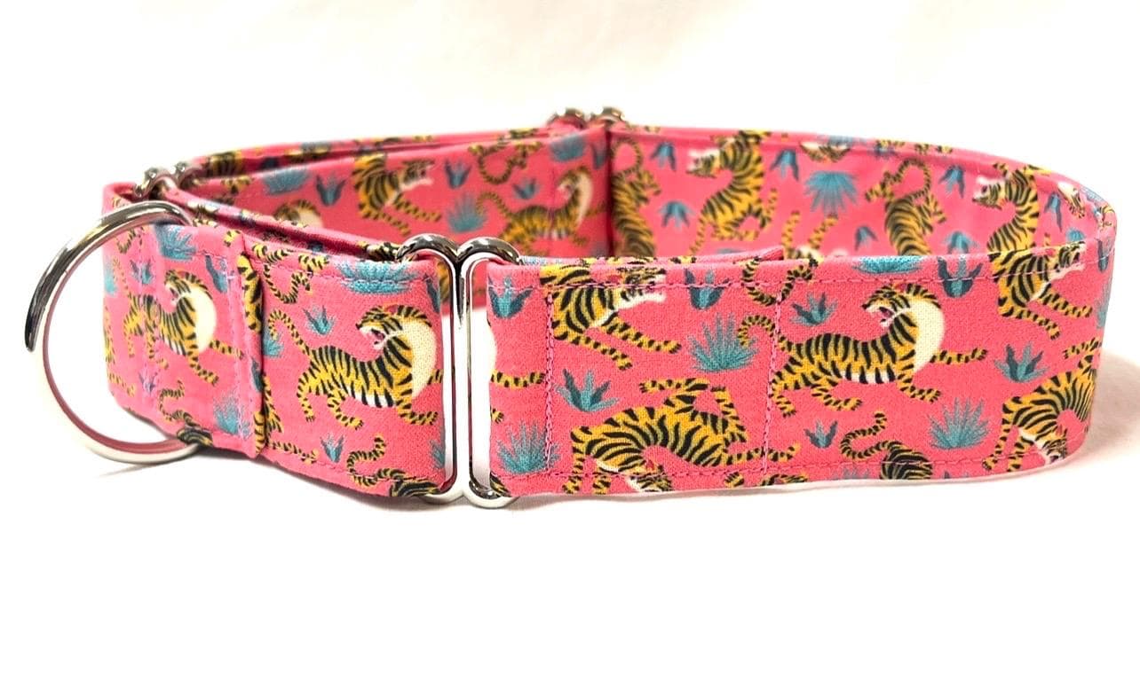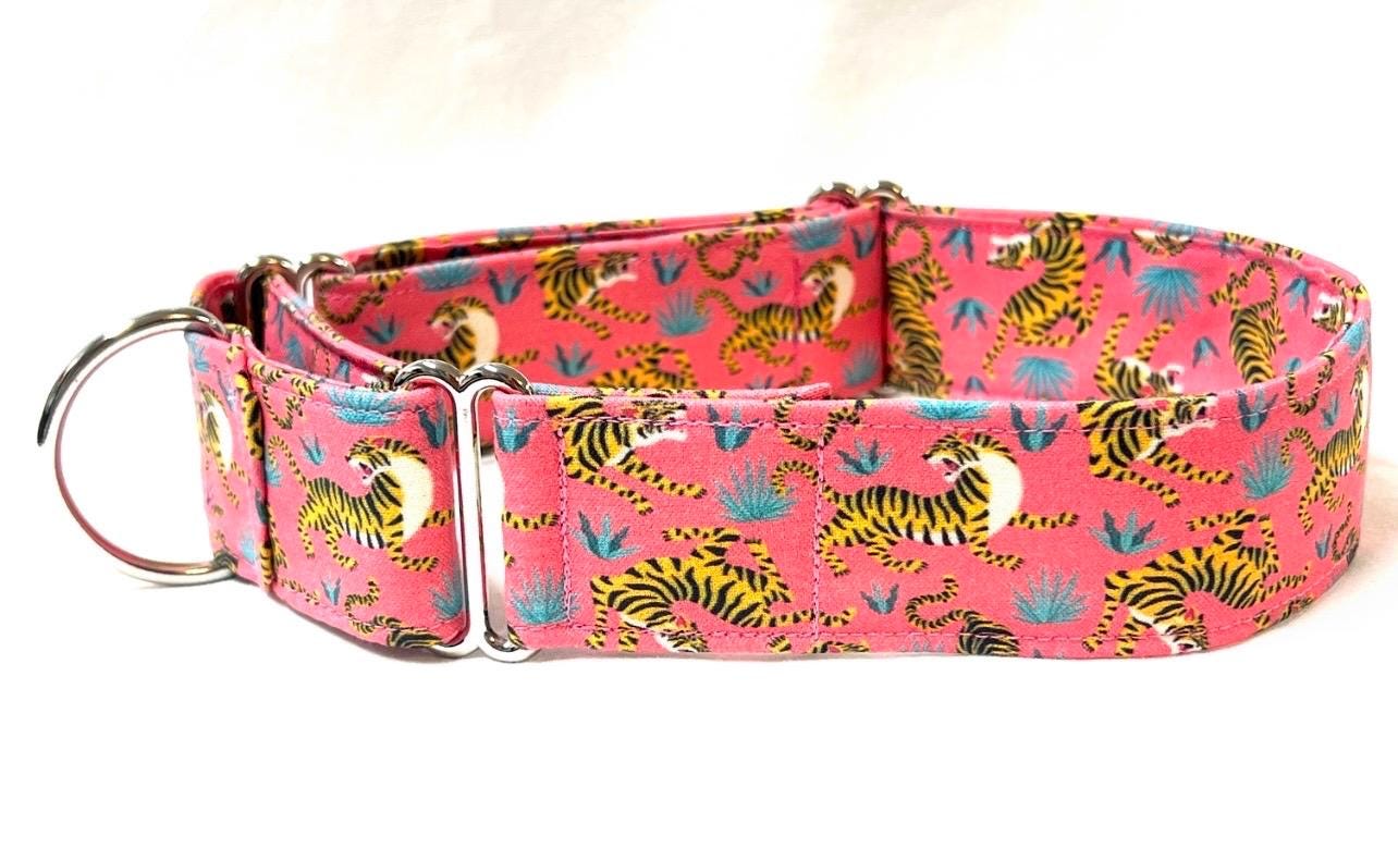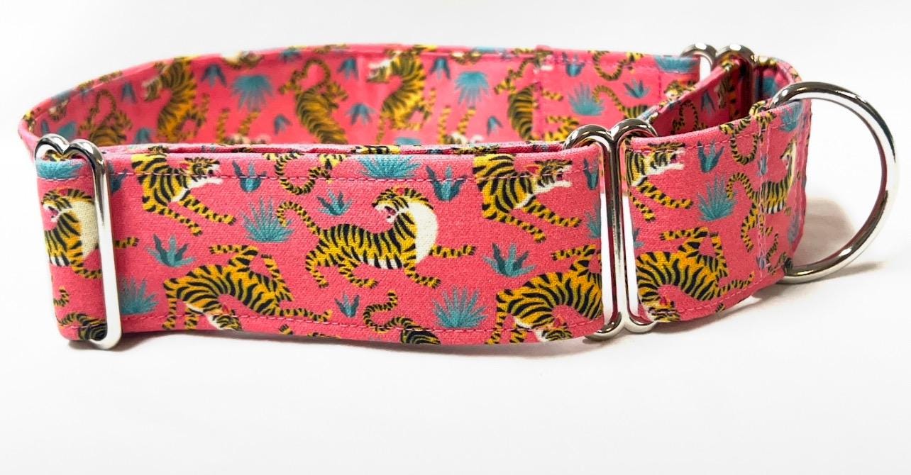 Fierce Tigers! Your girl or boy dog will be the most stylish in your neighborhood with this head-turning martingale collar that features beautiful fighting tigers!