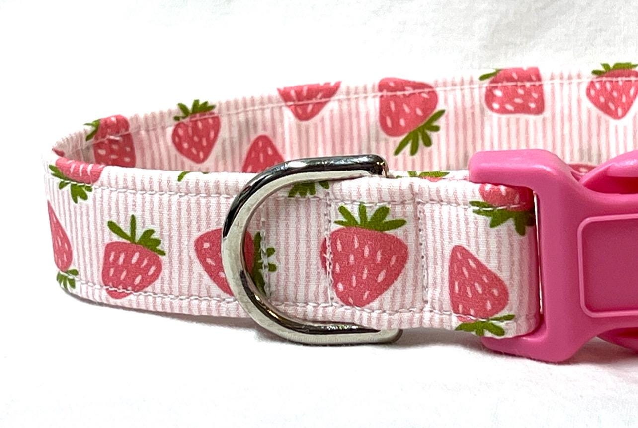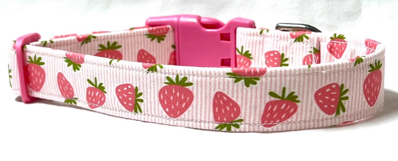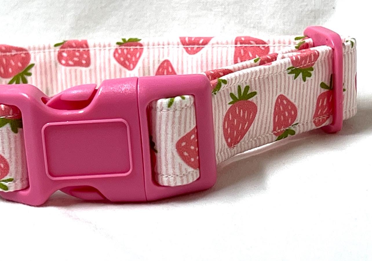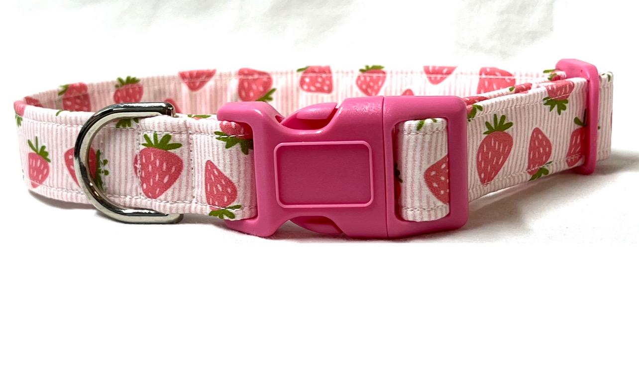 Your pup will look adorable in this charming dog collar featuring pink strawberries on a striped background!