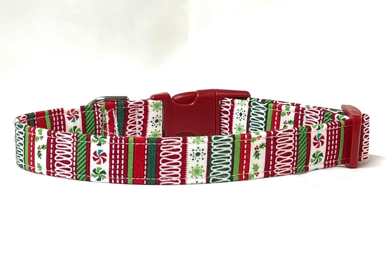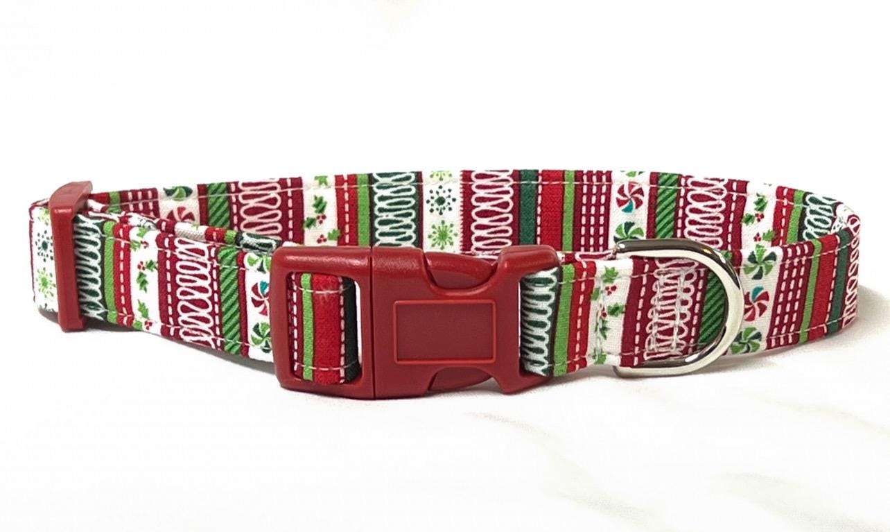 The holidays will be "Paw-fect" for your pet with this cheerful Christmas Candy Stripes fabric collar for a girl or boy dog!