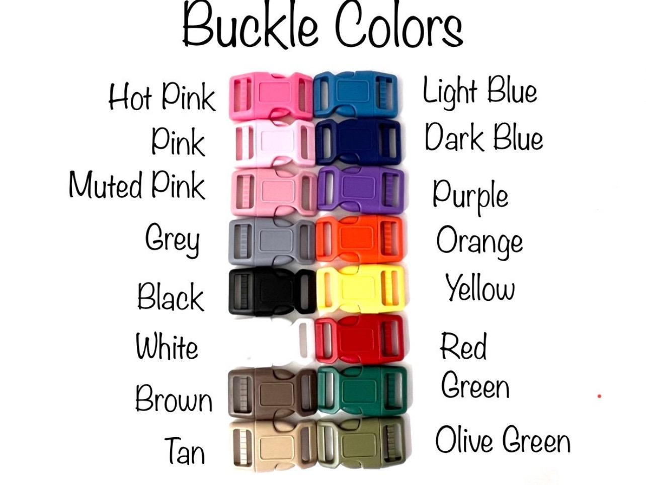 You put your own touch on the collar’s design by picking the buckle color! A photo showing all of the buckle colors is above.