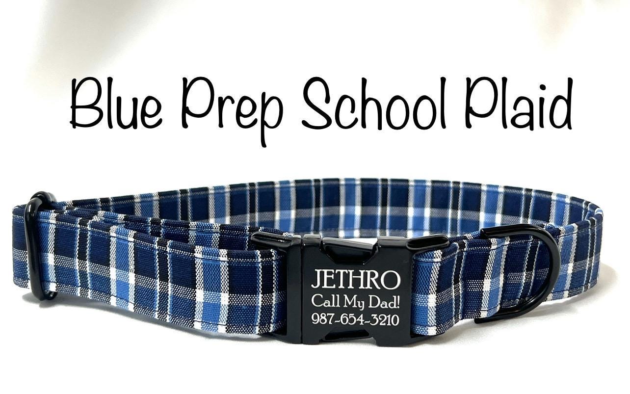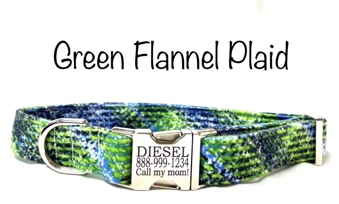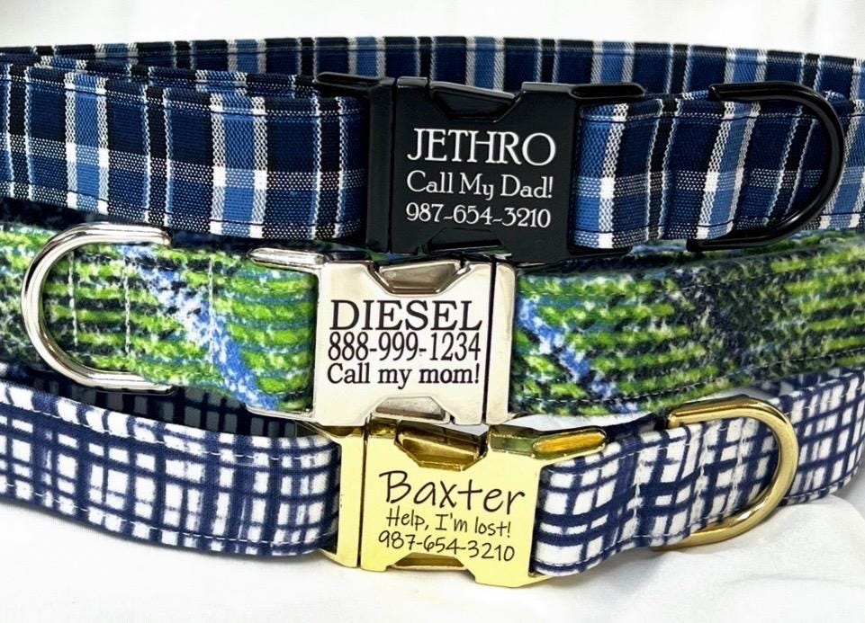 Your boy dog will be the most stylish in your neighborhood with an eye-catching personalized engraved metal collar in your choice of three fabrics: