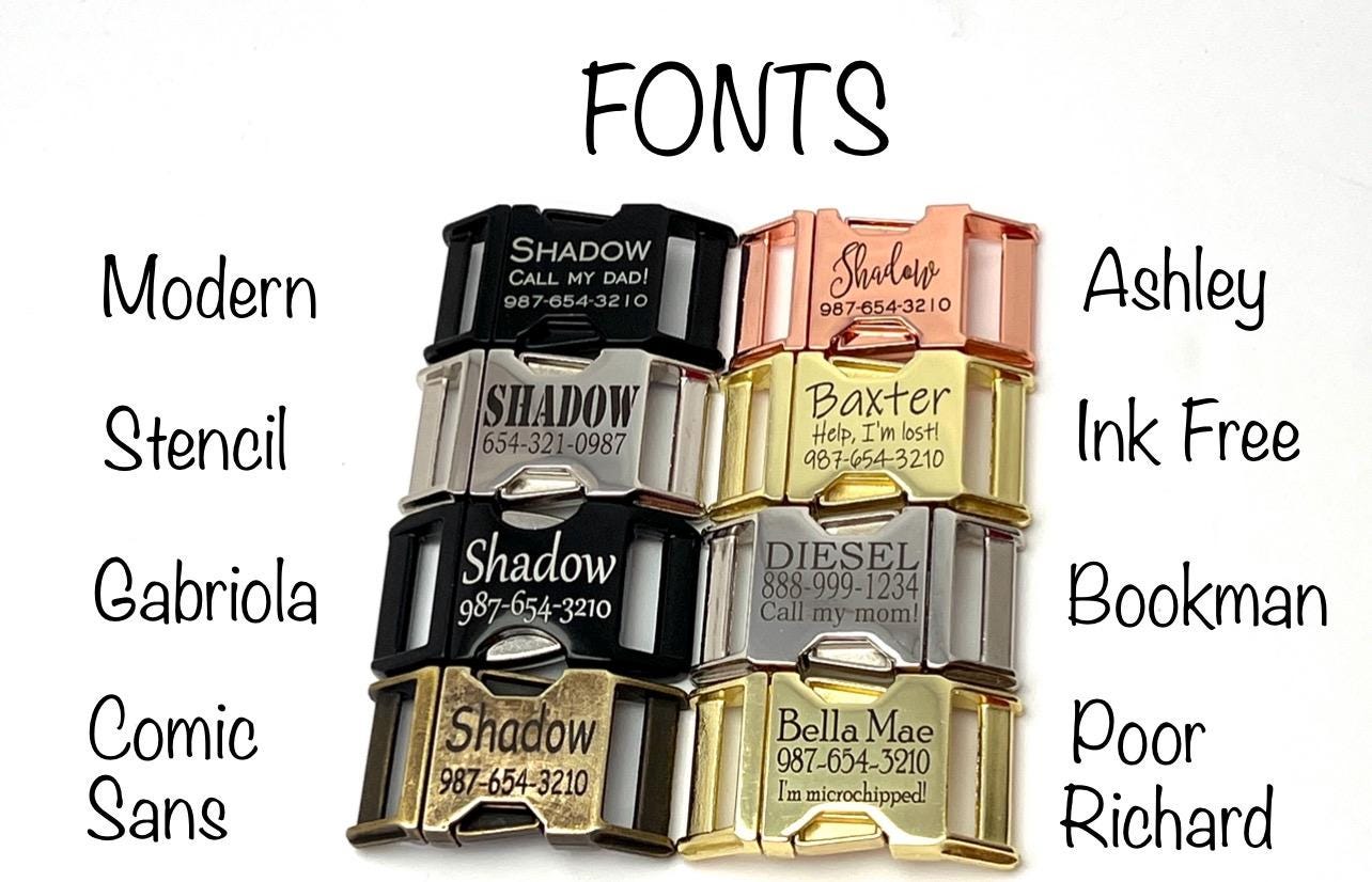- Ashley (1-2 lines only for buckles 5/8”, 3/4” and 1” wide, bottom line will be Modern or Goudy font)