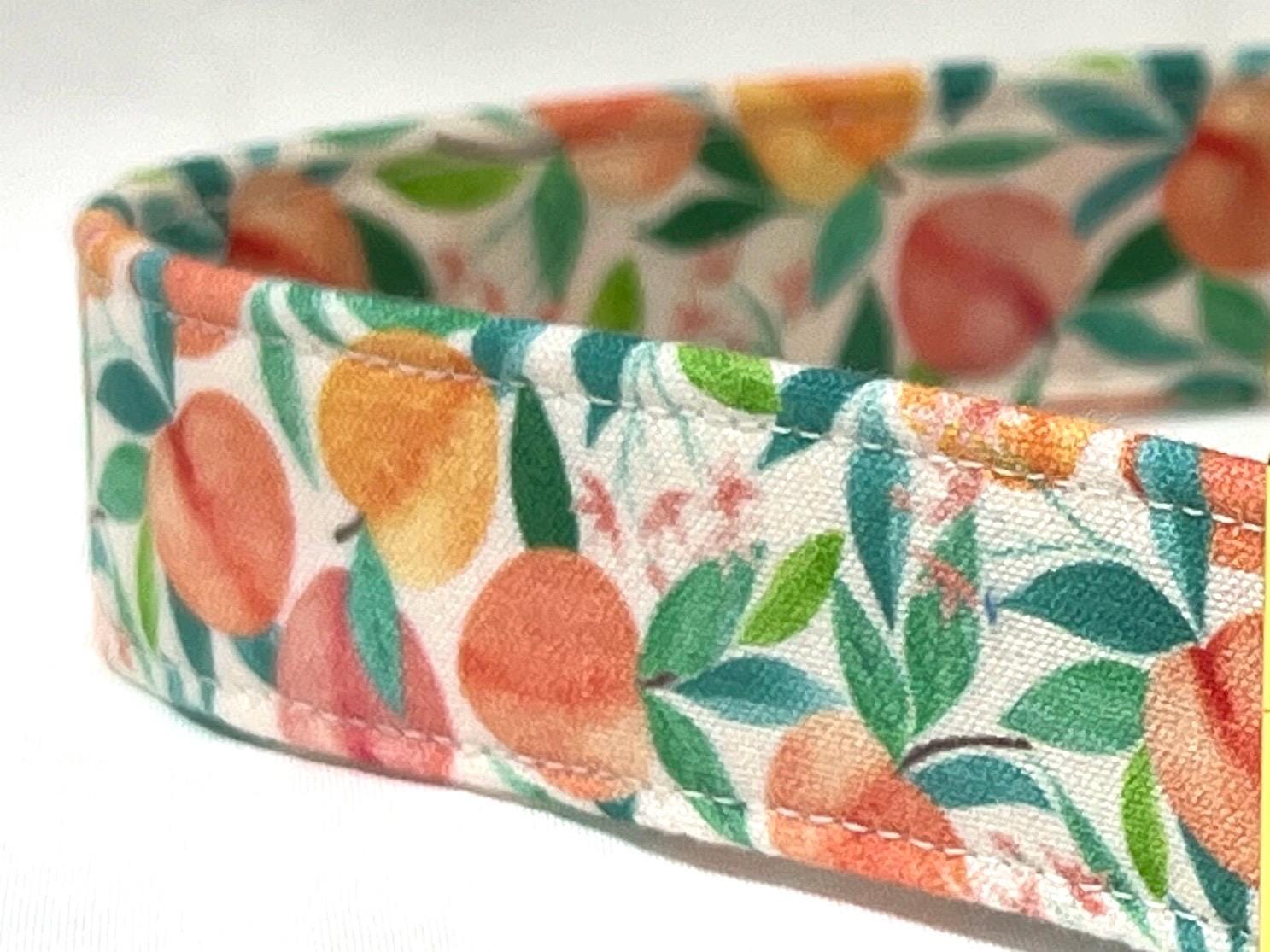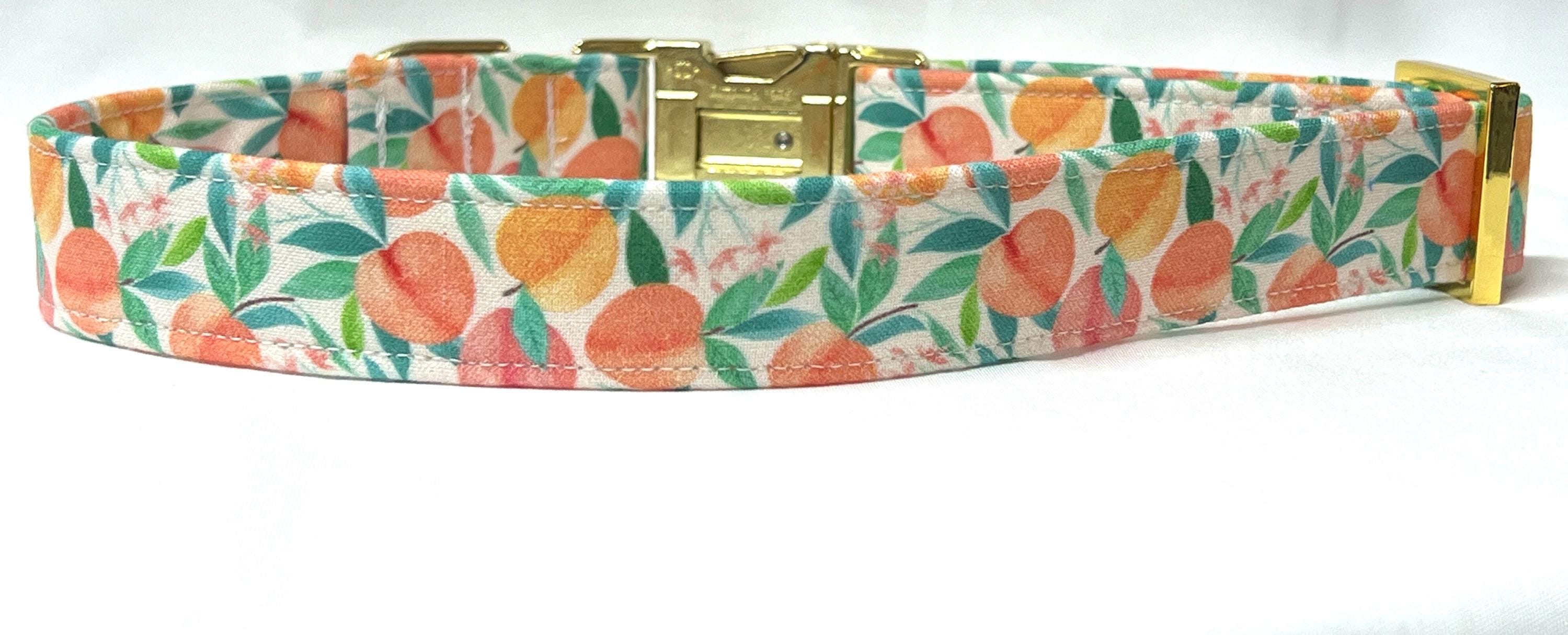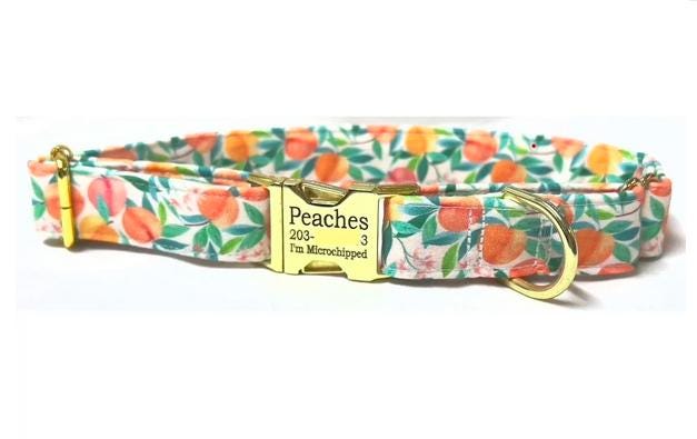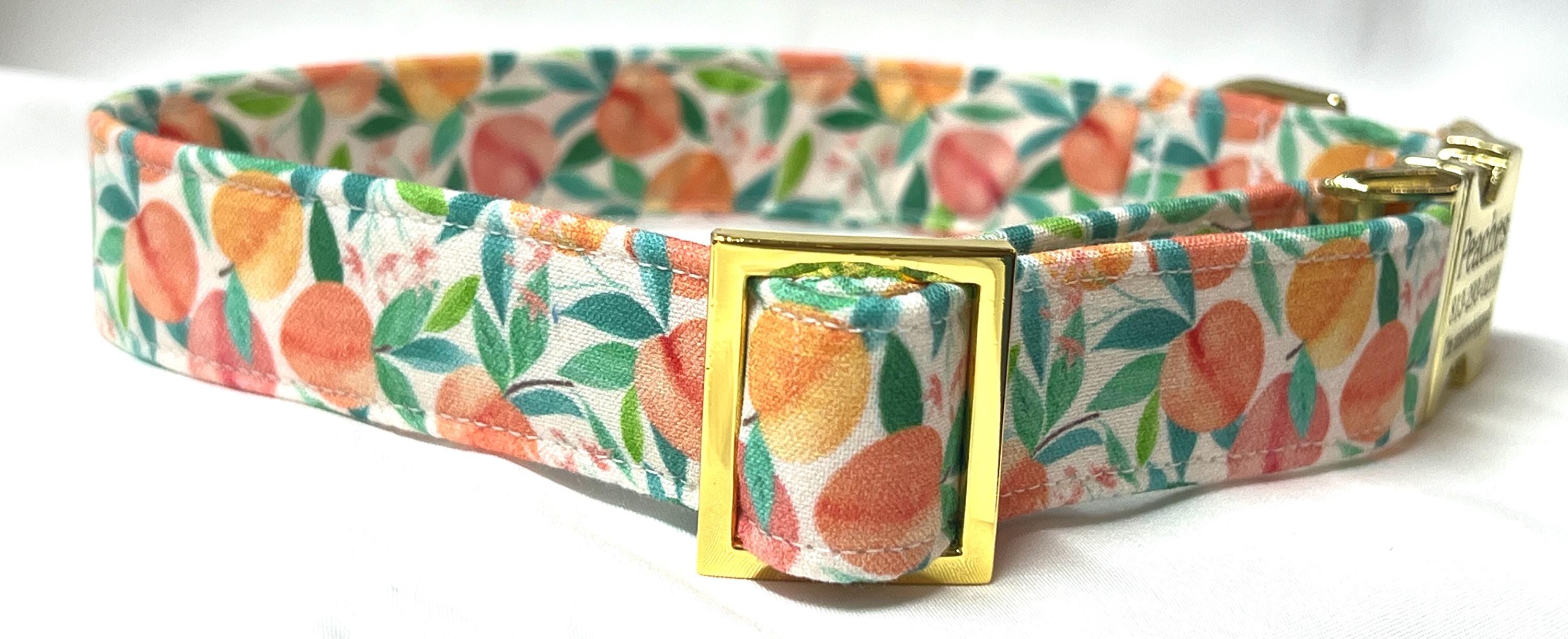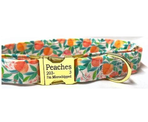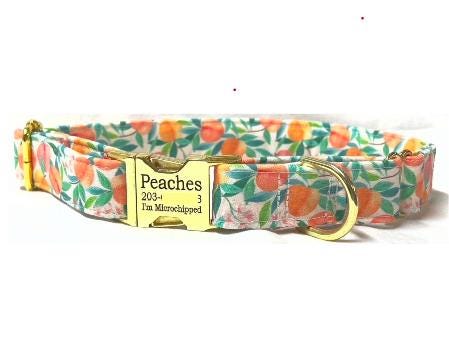 Your girl or boy dog will be super stylish in this Pretty Peach Tree fabric martingale collar with a personalized engraved buckle.