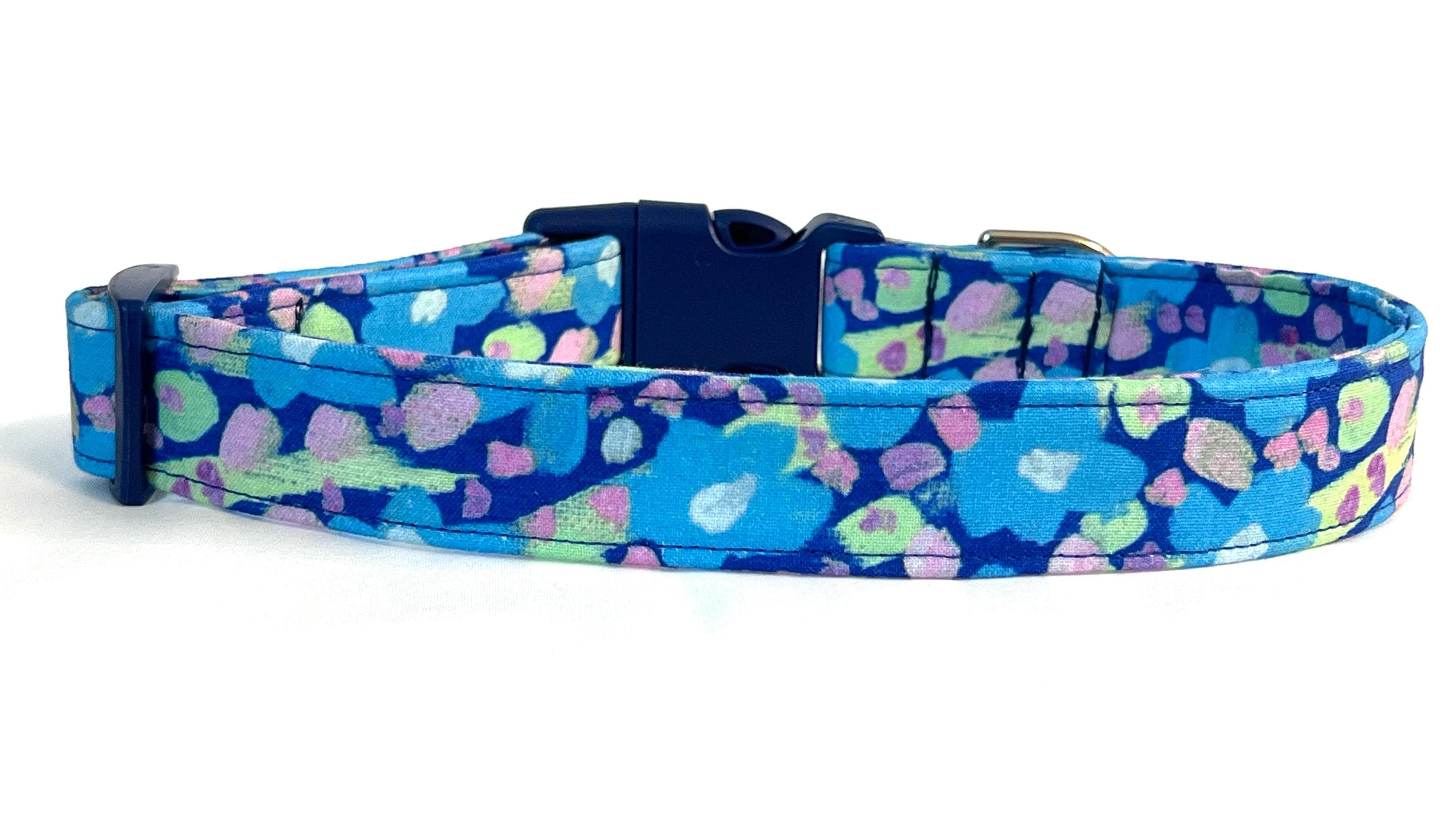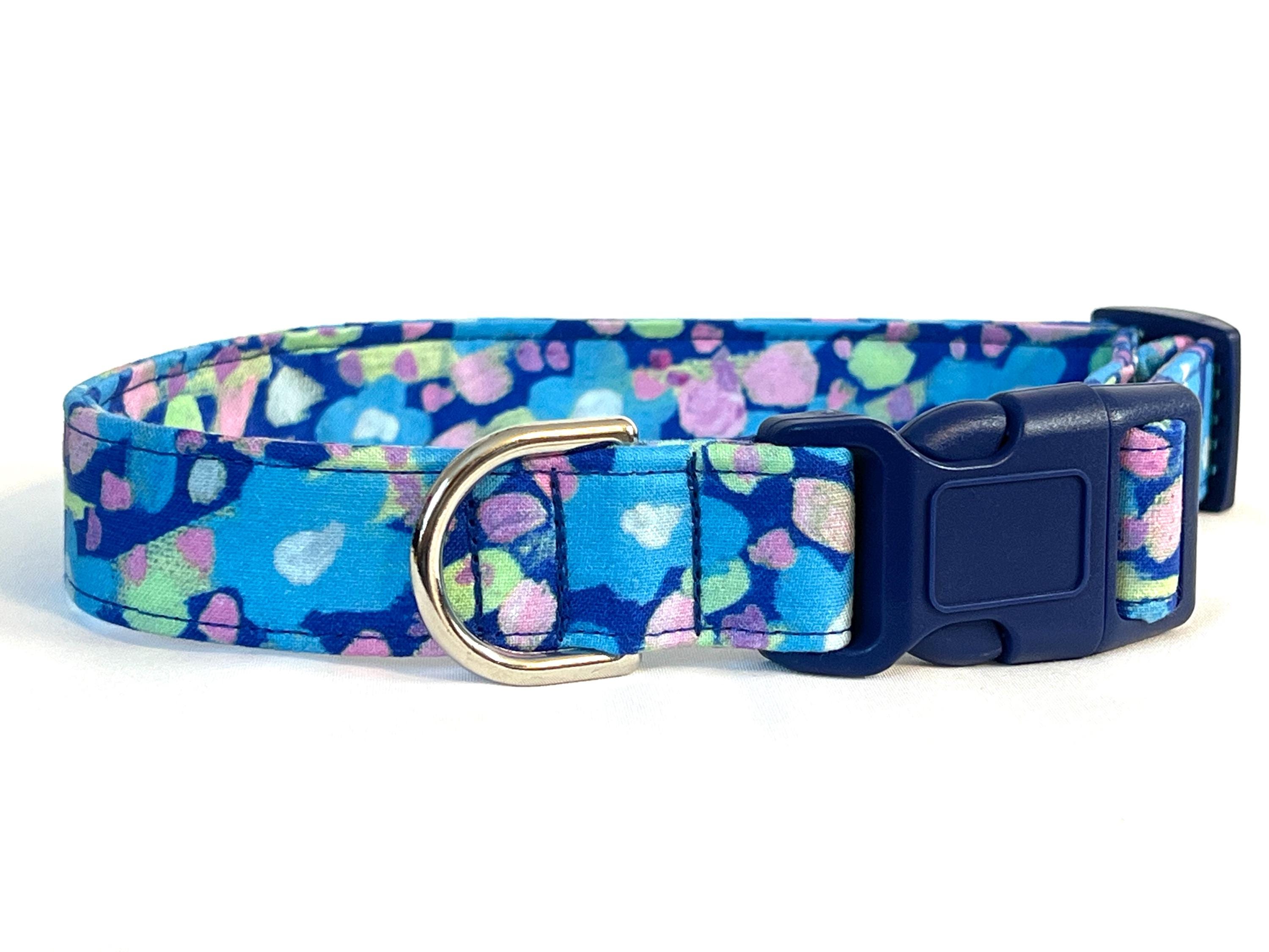 This eye-catching adjustable collar is perfect for the boy dog whose not afraid to stand out in a crowd! The fabric is an abstract floral print from designer Jennifer Paganelli.
