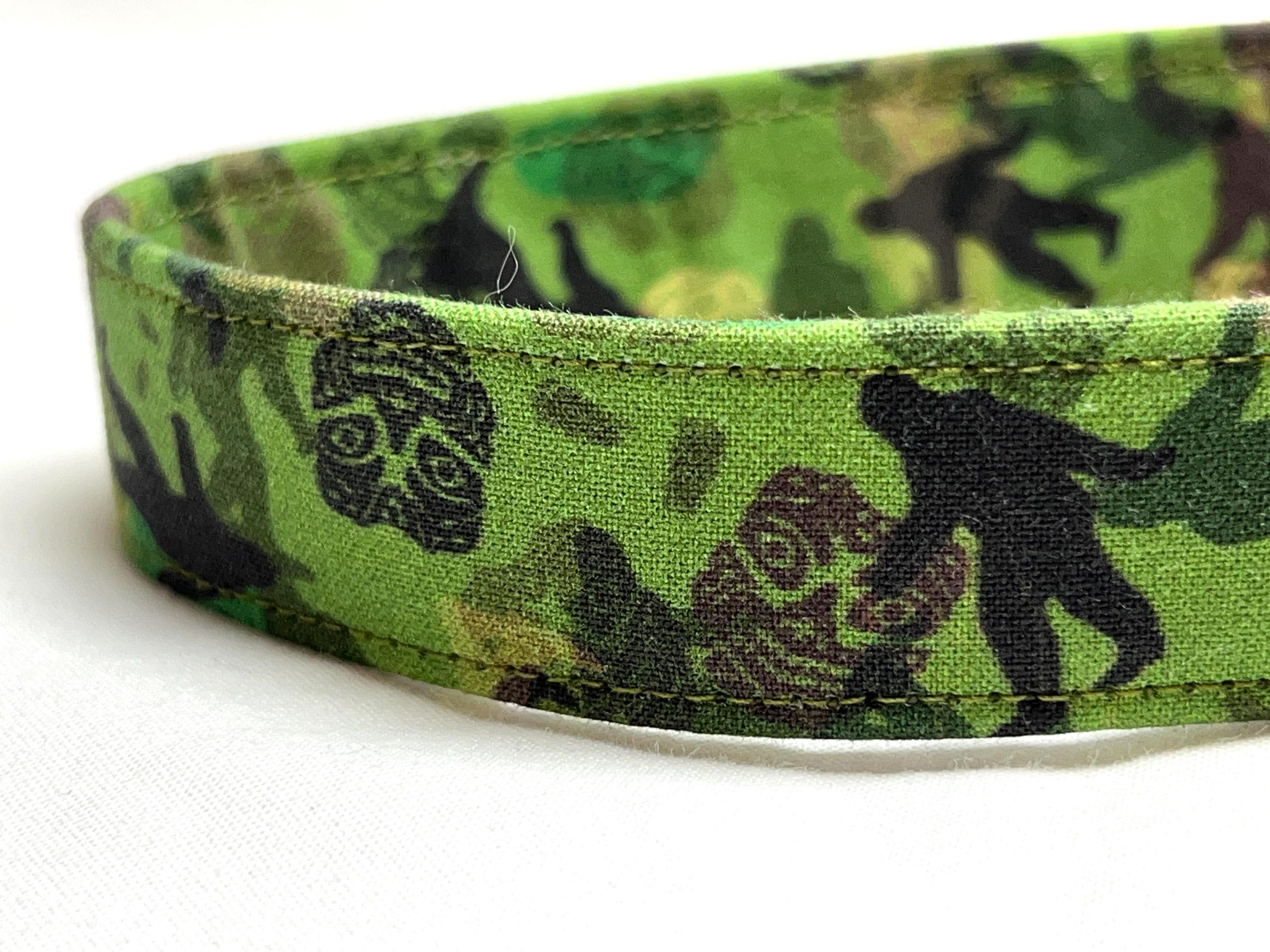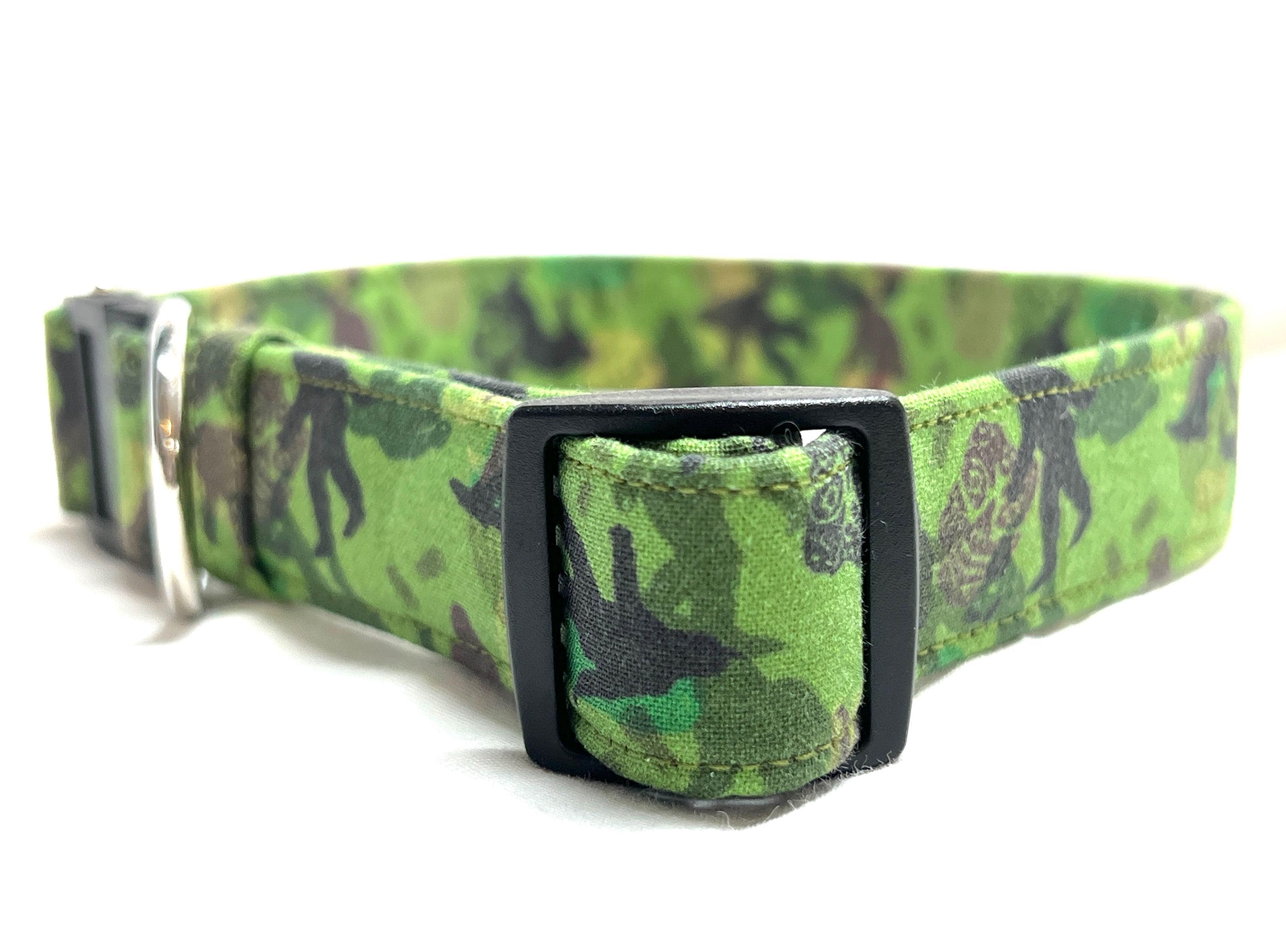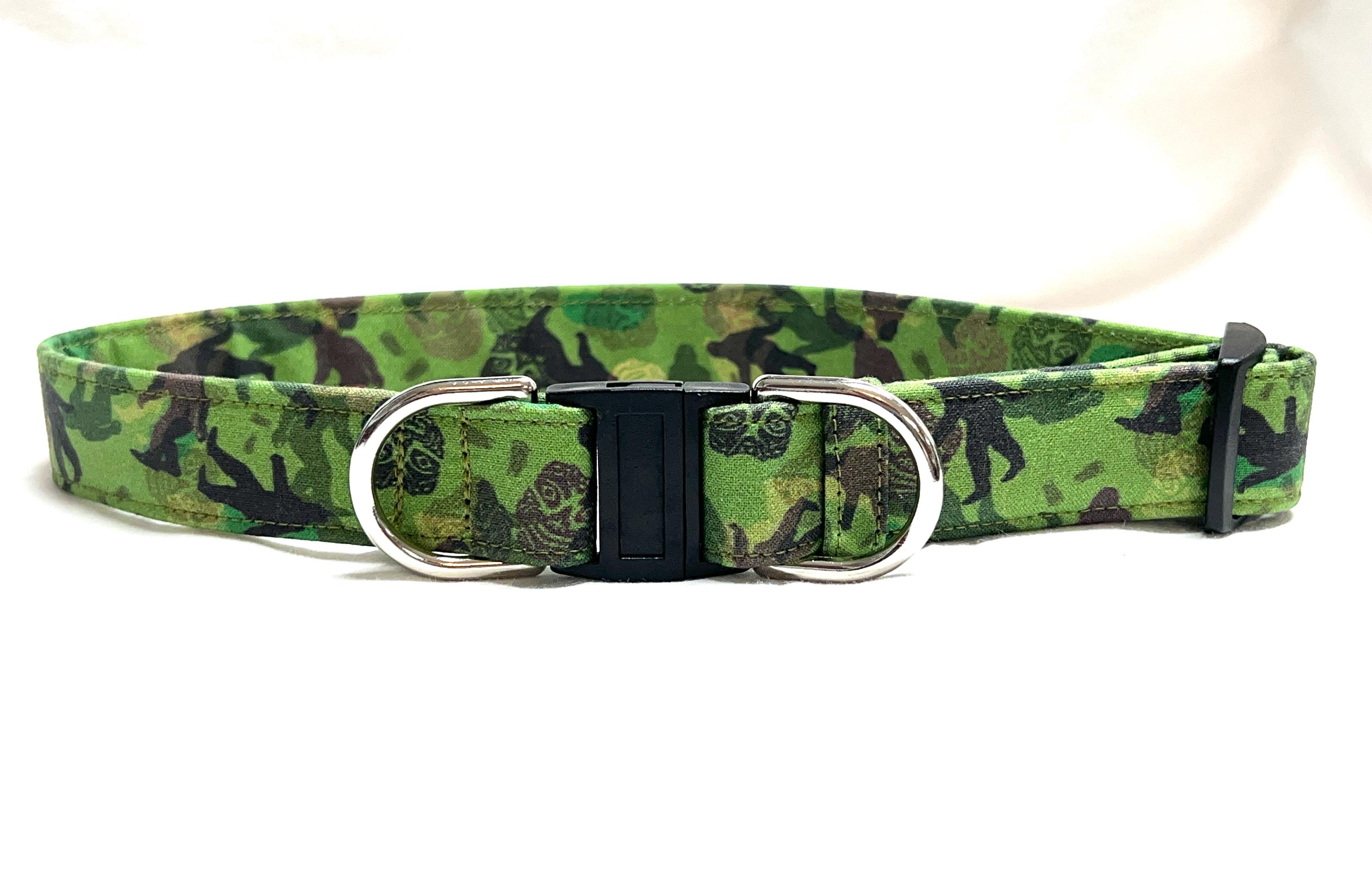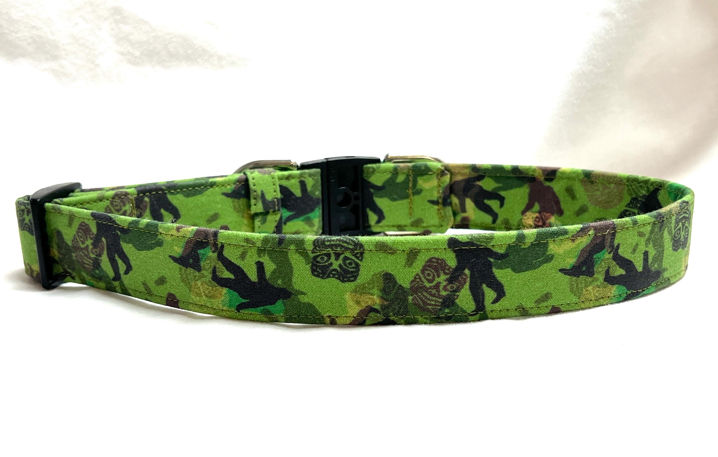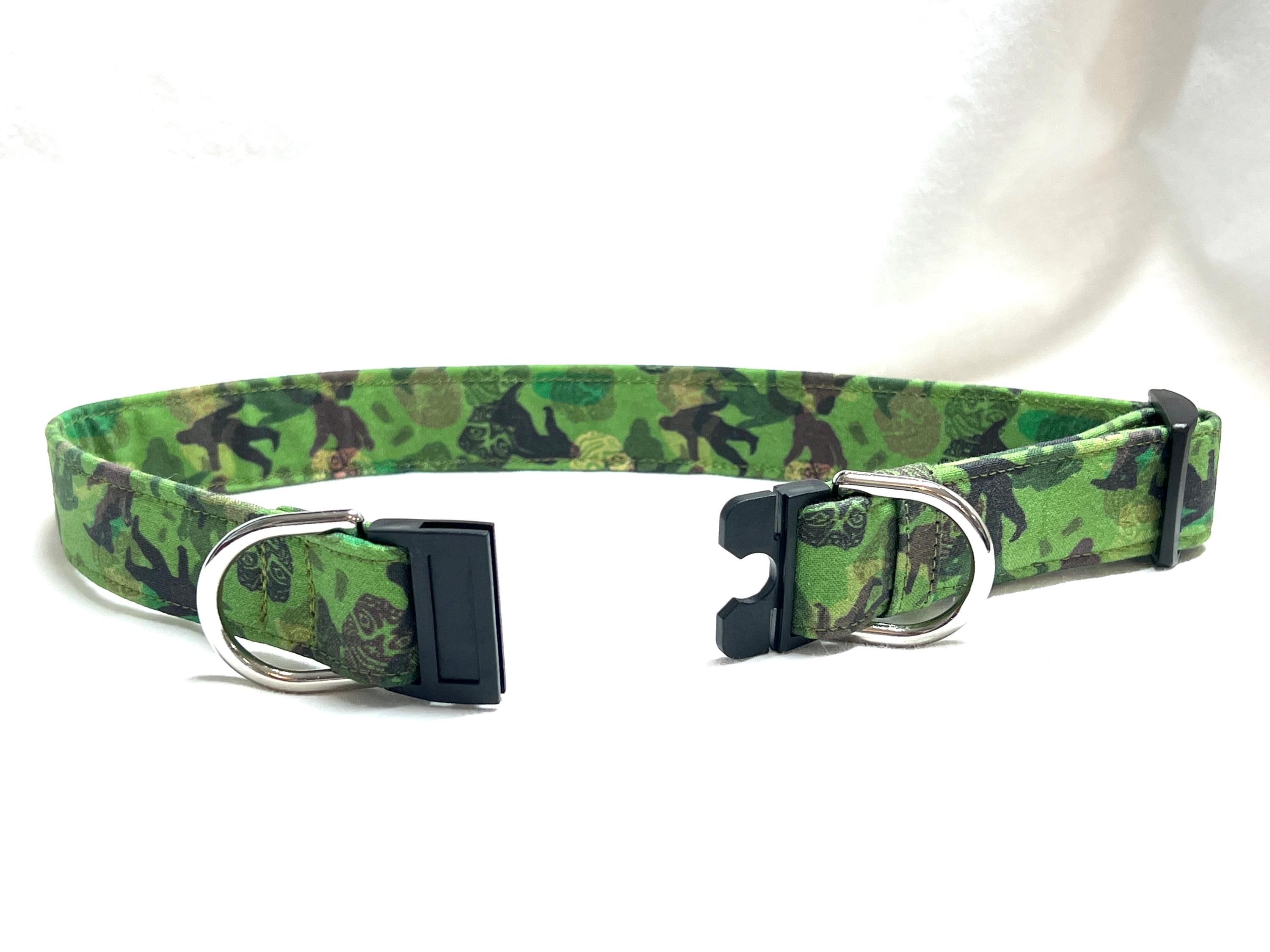 This is the perfect breakaway dog collar for the hipster pup! The green and brown camouflage design features mysterious creatures of the forest often called Bigfoot, Sasquatch or Skunk Apes. How fun is that?!