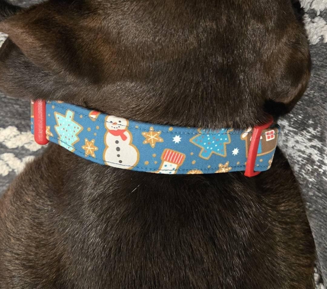 The holidays will be "Paw-fect" for your dog with this adorable Christmas gingerbread cookie fabric collar for a girl or boy dog! The design includes snowmen, gingerbread men, Christmas stockings, peppermint candy, snowflakes and more!