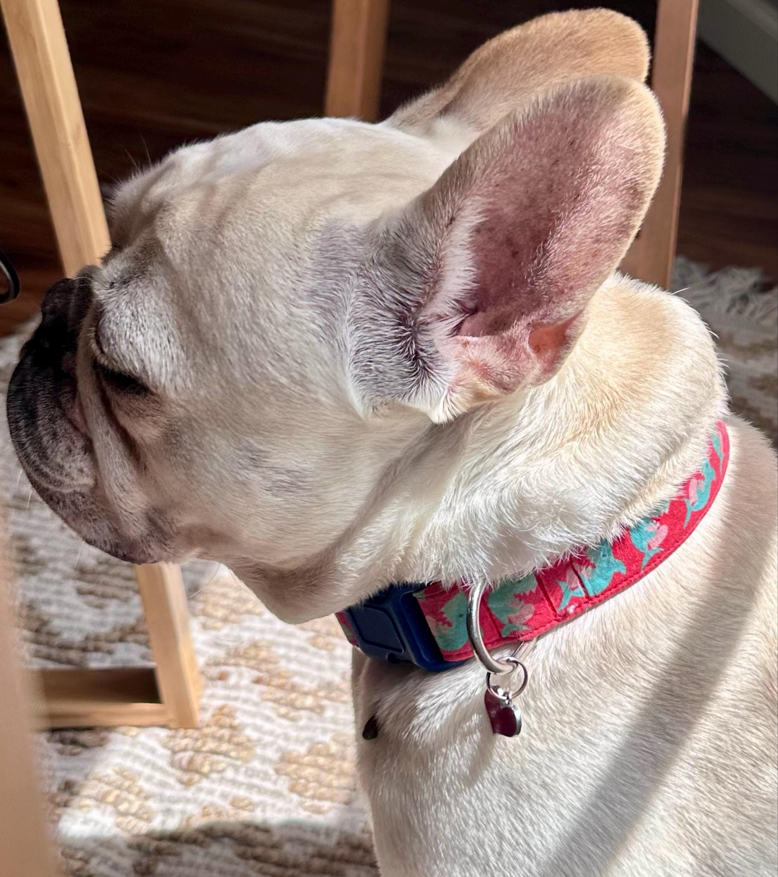 My little guy looks so dashing in his shark heart collar! And she included an adorable enamel heart charm to match. Long time repeat customer and her collars are exceptional. Excellent quality, great prints, strong even to leash pulling!
