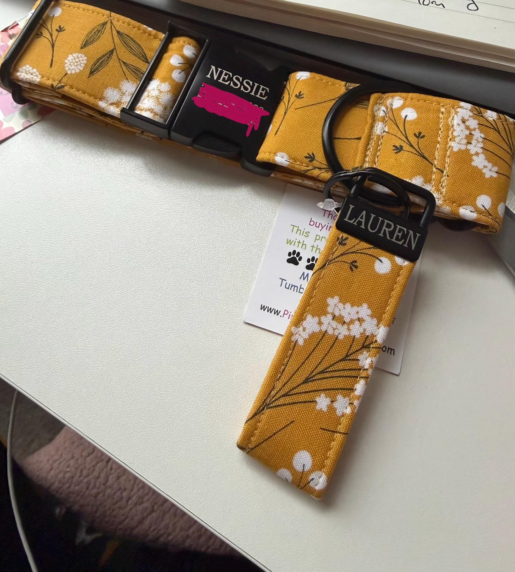 Pick a fabric from any dog collar in my shop and I will make you a martingale style dog collar that has a personalized laser engraved buckle. The hardware on the collar will match the buckle.