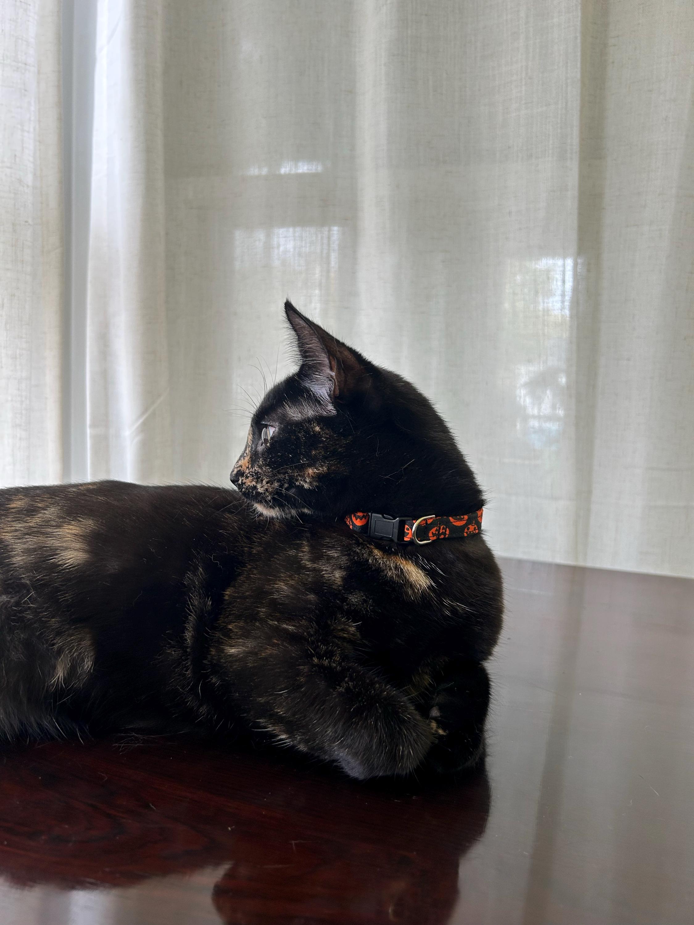 This charming cat collar features adorable smiling pumpkins and is the perfect way for your kitty to celebrate Halloween without having to get dressed up!